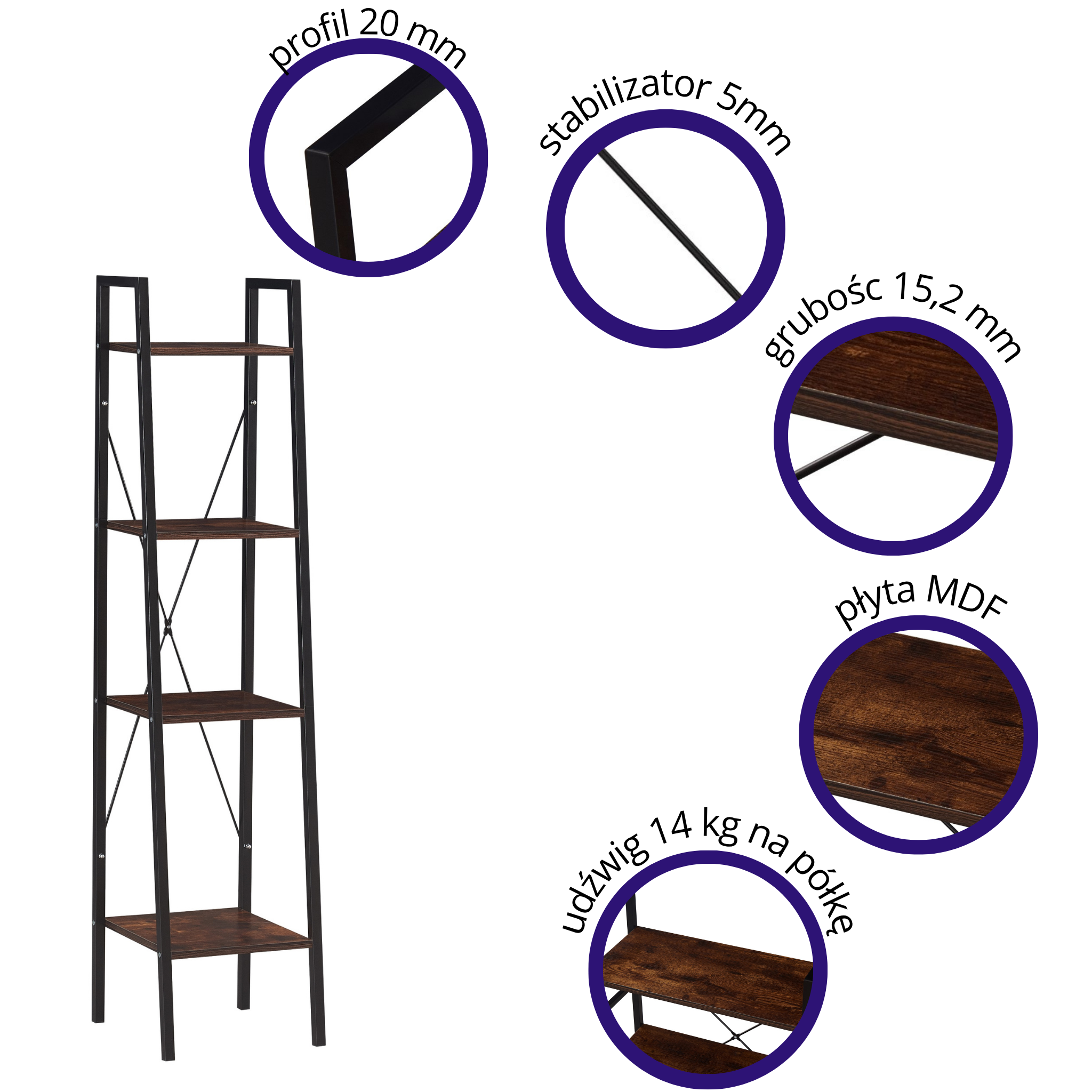 Dzięki wysokości 147,5 cm oraz czterem praktycznym półkom regał oferuje dużo miejsca do przechowywania i ekspozycji. Idealnie sprawdzi się jako regał na książki, dekoracje, rośliny czy akcesoria biurowe. Otwarta konstrukcja bez pleców podkreśla loftowy styl i dodaje lekkości, dzięki czemu mebel świetnie komponuje się w salonie, biurze, sypialni czy pokoju młodzieżowym.