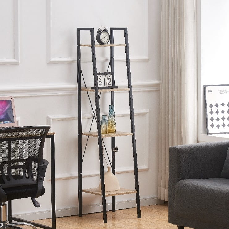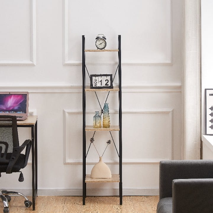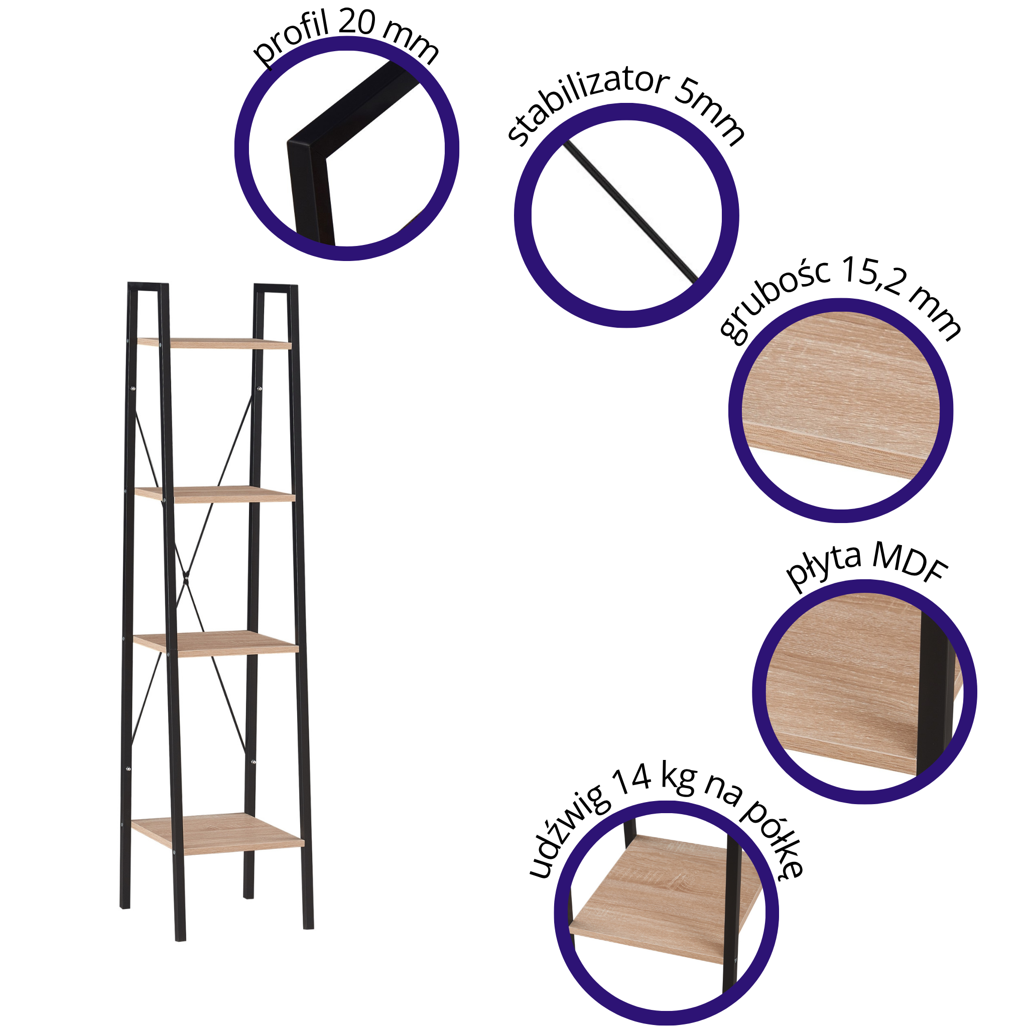 Dzięki wysokości 147,5 cm oraz czterem praktycznym półkom regał idealnie sprawdzi się jako regał na książki, ozdoby, rośliny czy akcesoria biurowe. Otwarta konstrukcja bez pleców podkreśla loftowy charakter i dodaje lekkości aranżacji, pasując zarówno do salonu, biura, jak i pokoju młodzieżowego.