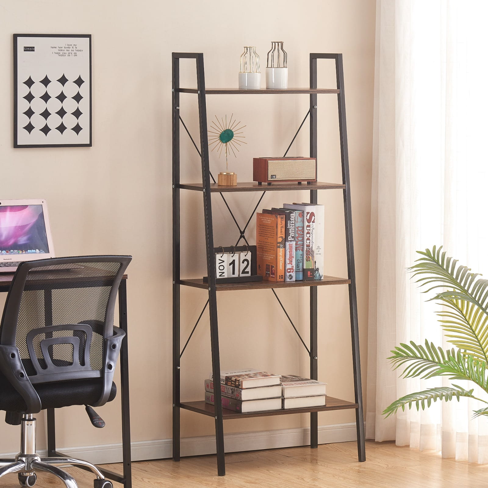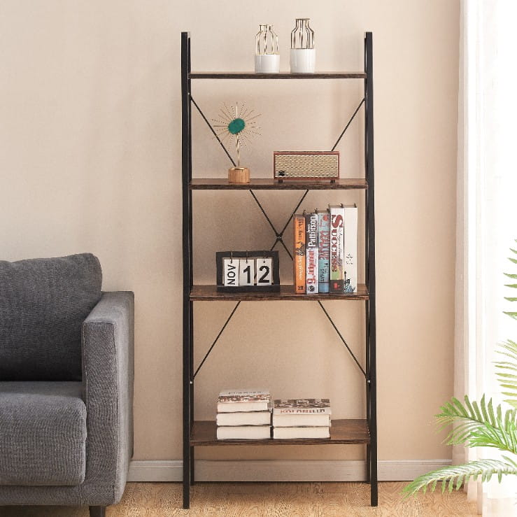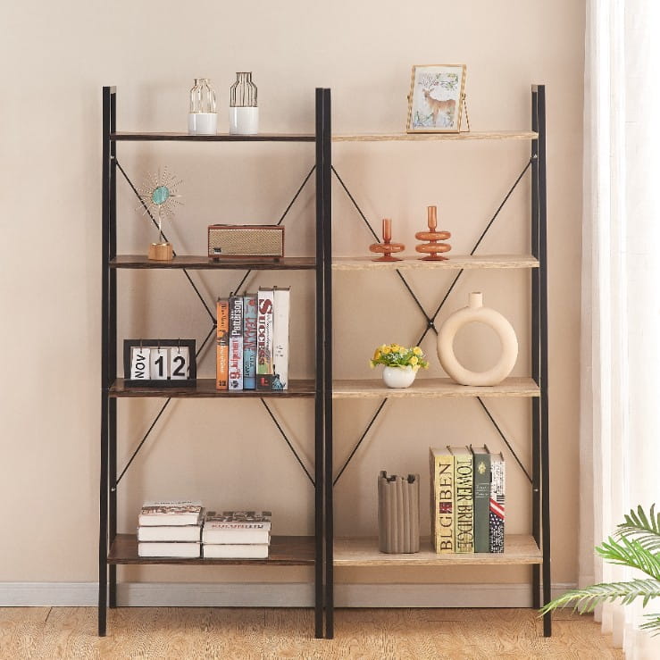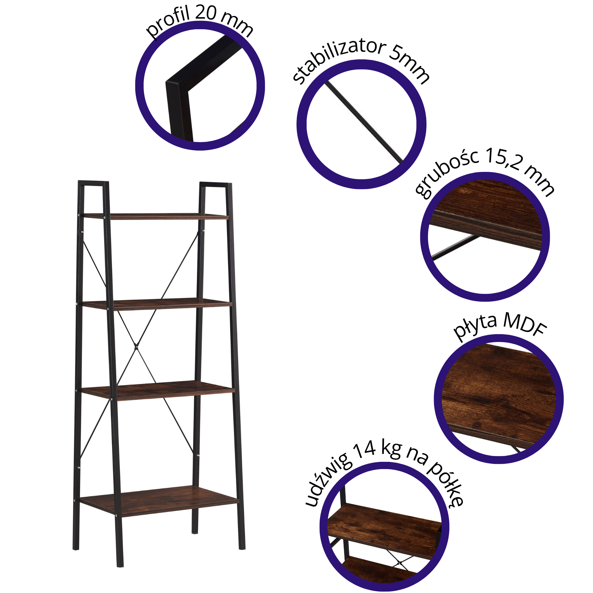 Dzięki wymiarom 147,5 cm wysokości, 60 cm szerokości i 34 cm głębokości, regał oferuje dużo miejsca na przechowywanie i eksponowanie ulubionych przedmiotów. Cztery praktyczne półki sprawdzą się doskonale jako regał na książki, ozdoby, rośliny czy akcesoria biurowe. Otwarta konstrukcja bez pleców podkreśla loftowy charakter mebla i nadaje lekkości wnętrzu.