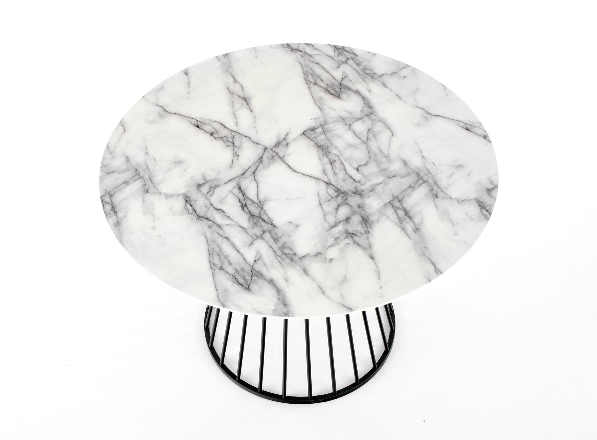 Stół został wykonany z wysokiej jakości materiałów. Blat imituje naturalny biały marmur, który nadaje mu wyjątkowego uroku. Jego gładka powierzchnia jest łatwa do czyszczenia i odporna na zarysowania.