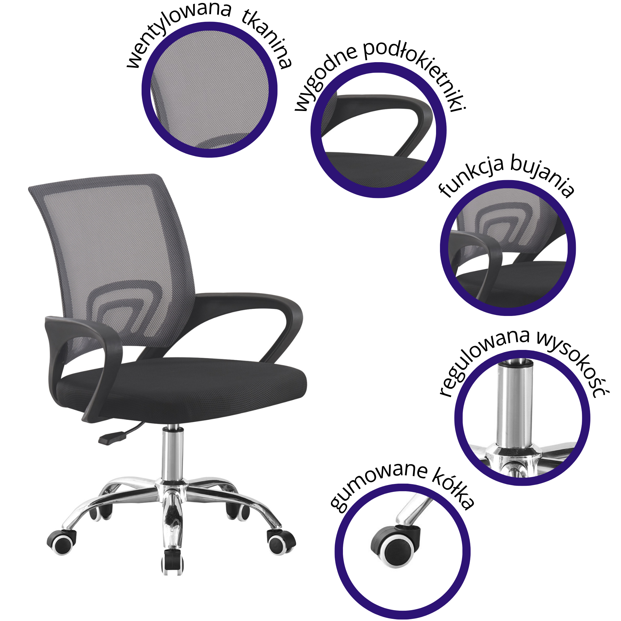 Solidna konstrukcja w połączeniu z wyprofilowanym siedziskiem, ergonomicznymi podłokietnikami i wentylowanym oparciem gwarantuje wygodę nawet podczas wielu godzin użytkowania. Gazowy podnośnik zapewnia płynną regulację wysokości oraz lepszą amortyzację, a chromowana podstawa dodaje elegancji i wytrzymałości całej konstrukcji.