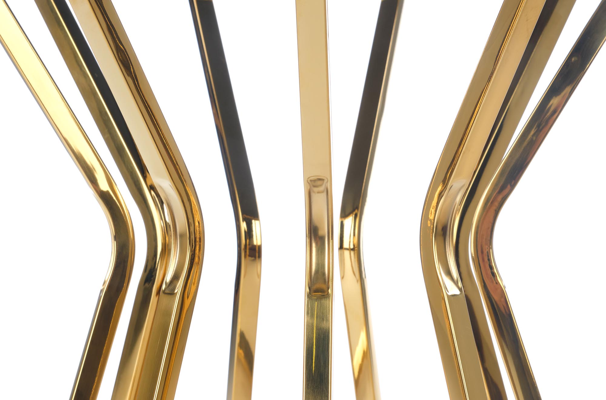 Styl Glamour i Elegancja:** Ława Glamour emanuje luksusem i elegancją. Złoty kolor stalowego stelaża wspaniale komponuje się z lustrzanym blatem ze szkła, tworząc wyjątkowy wygląd.