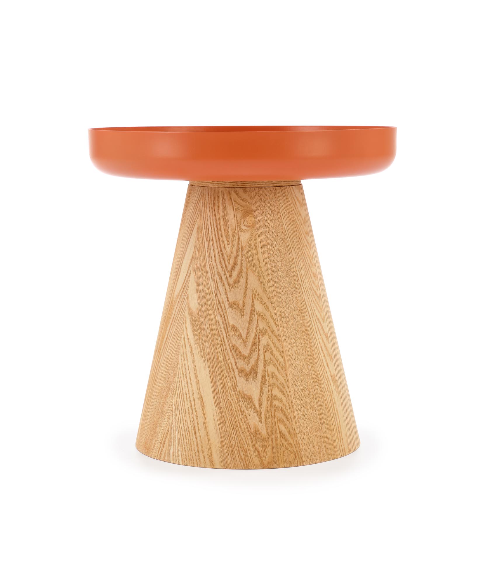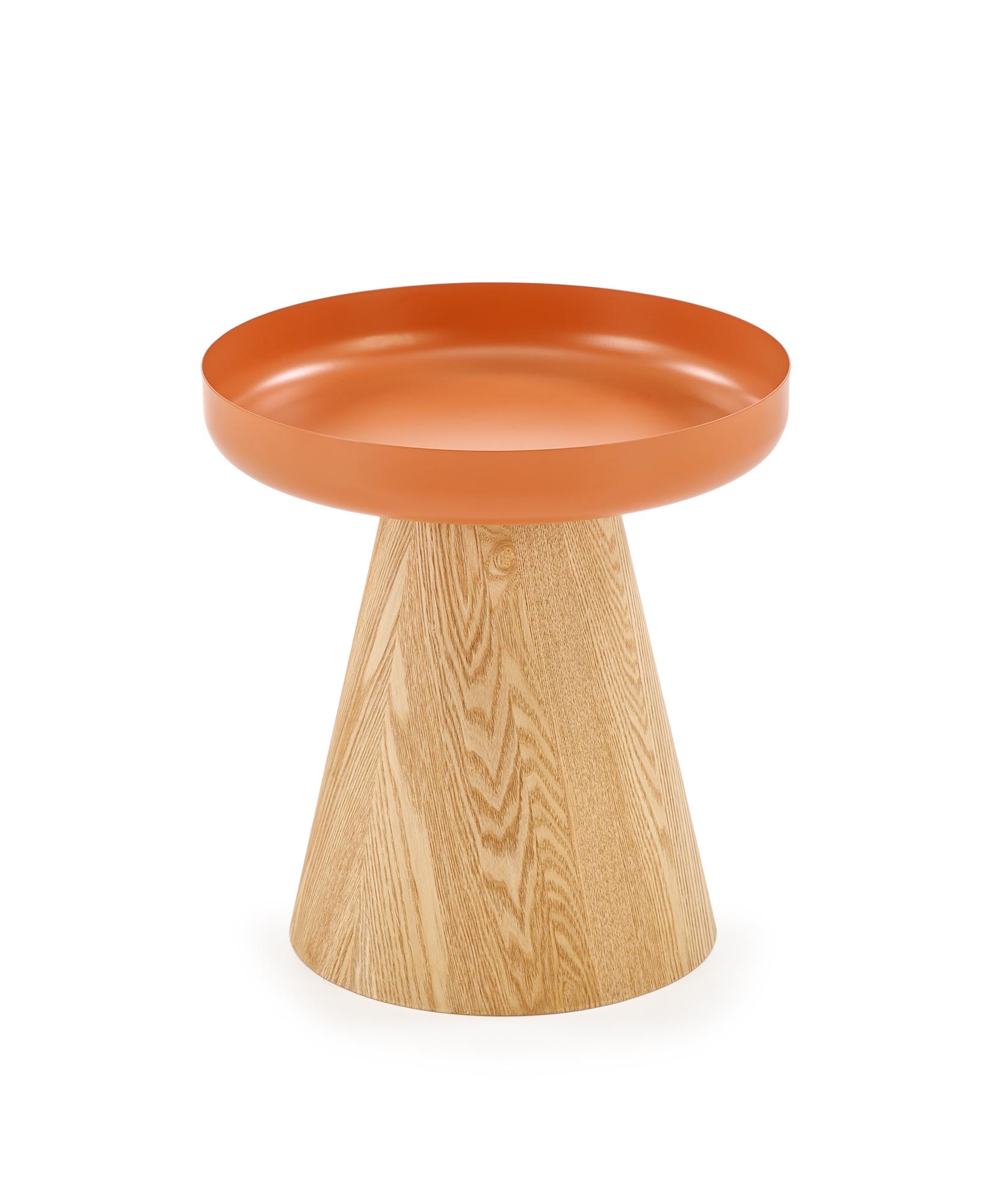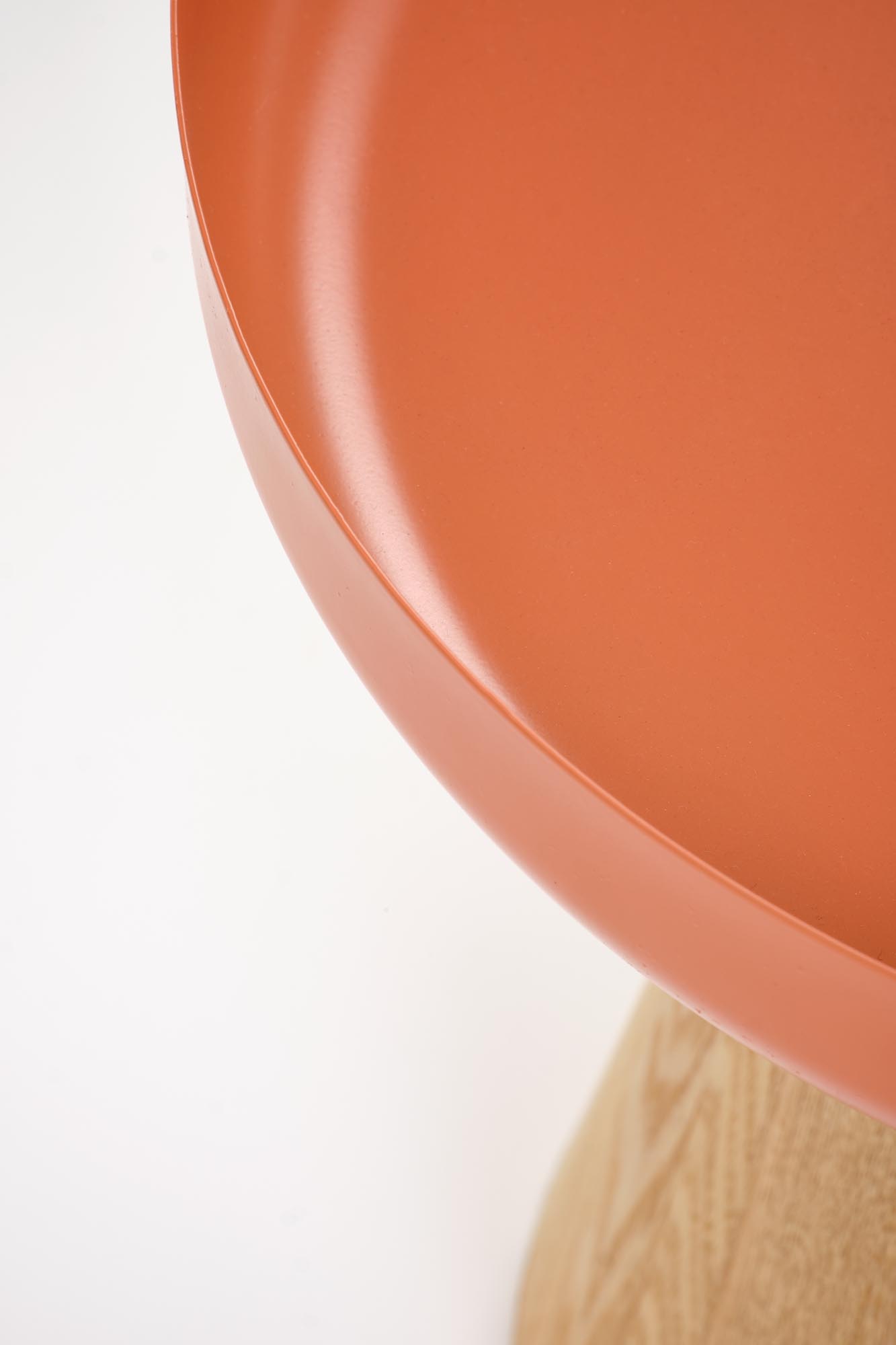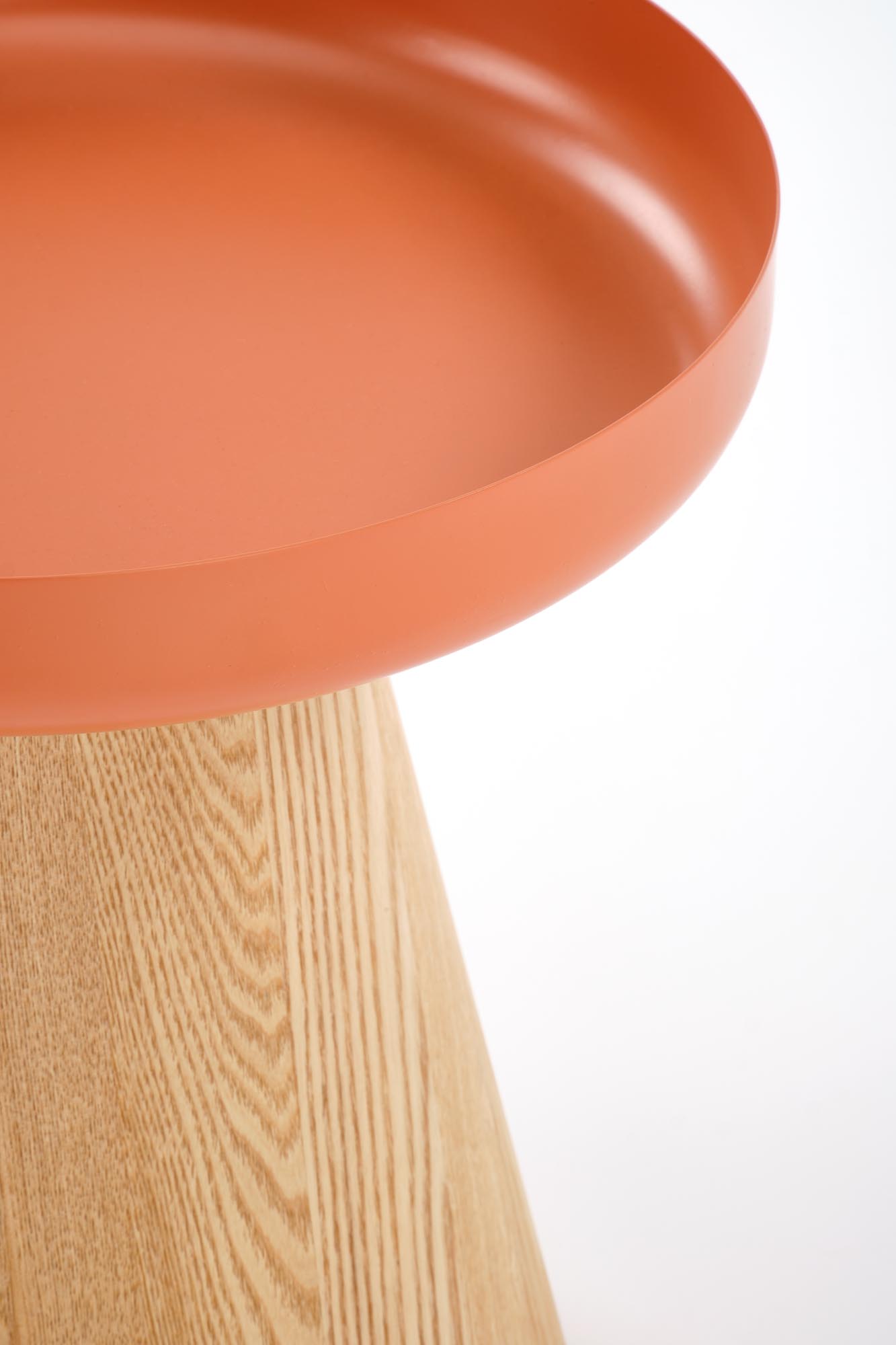 Stolik GINA to wyjątkowe połączenie nowoczesnej elegancji z naturalnym stylem. Blat ze stali malowanej proszkowo w ciepłym cynamonowym odcieniu dodaje wnętrzu oryginalności, a podstawa z MDF z naturalną okleiną zapewnia stabilność i trwałość. Dzięki kompaktowym wymiarom doskonale sprawdzi się jako stolik kawowy, boczny czy nocny, pasując do wnętrz w stylu skandynawskim, industrialnym i nowoczesnym.