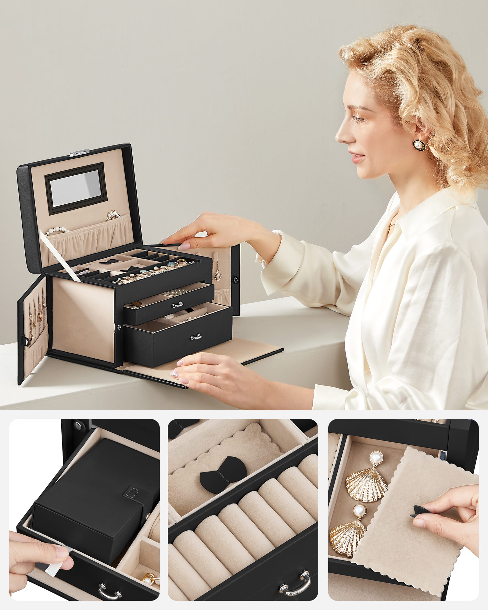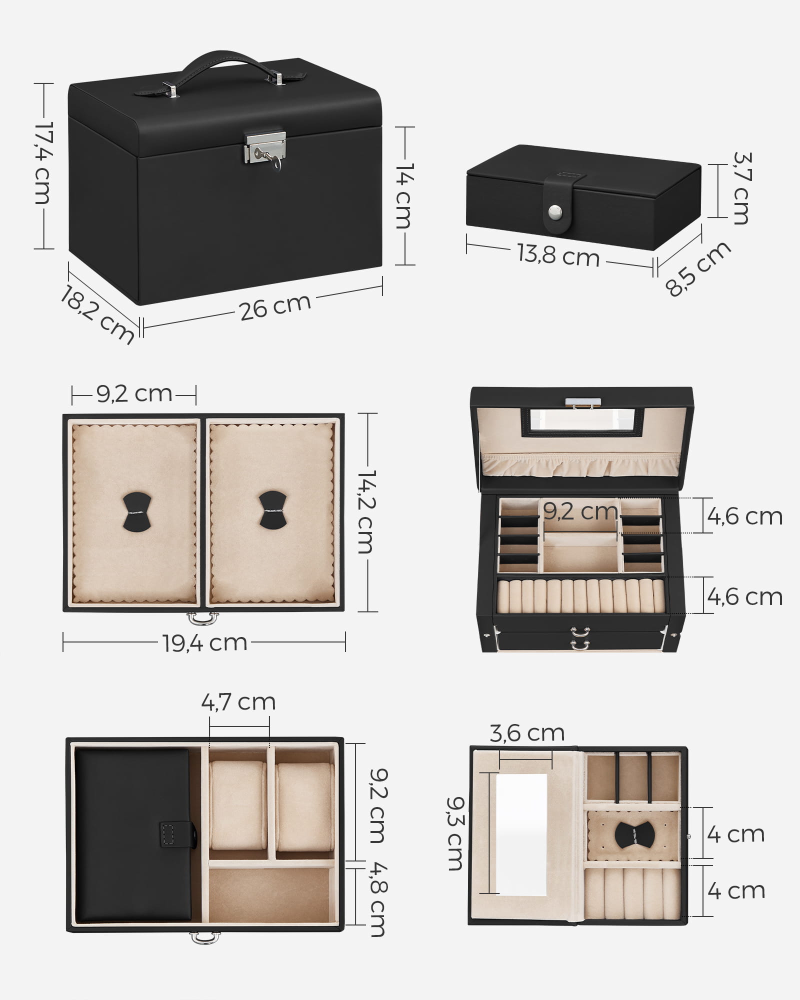 Kasetka na biżuterię, zegarki, z szufladami, czarna, praktyczna - JBC121B