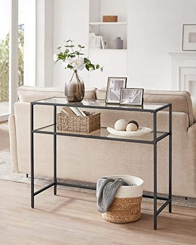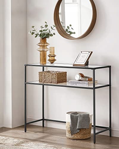 Konsola wykonana ze szkła i stali malowanej proszkowo na kolor czarny. Produkt tworzy niesamowitą dekorację Twojego pomieszczenia. Półki konsoli są stabilne, a więc możemy umieścić na nich książki, kwiaty w wazonach, ozdobne figurki, dziecięce zabawki oraz ramki ze zdjęciami. Odpowiednie wymiary konsoli zapewniają wystarczająco dużo miejsca na nasze rzeczy. Nowoczesny a zarazem prosty wygląd, te cechy na pewno skłonią Cię do wyboru tego mebla. Mebel cechuje się uniwersalnością oraz funkcjonalnością, będzie świetnie pasował do salonu, sypialni, przedpokoju, domowego gabinetu. Konsola na pewno wpasuje się w wystrój niejednego pomieszczenia. Stalowa konstrukcja zapewnia stabilność mebla. Idealnie spasowane elementy ramy oraz szklane półki nadadzą Twojemu wnętrzu wdzięku. Zadbaj o estetykę swojego przedpokoju, salonu, pokoju dziennego czy sypialni wybierając produkty sprawdzone, o najwyższej jakości wykonania.