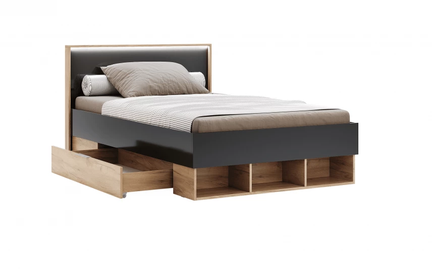 Wezgłowie z oświetleniem LED, może służyć jako stolik nocny. Łóżko jest wyposażone o funkcjonalne wnęki — trzy oddzielne otwarte przestrzenie do przechowywania. Świetne miejsce na przechowywanie niezbędnych rzeczy lub wnęki można uzupełnić dekoracjami. Łóżko o szerokości 1,2m i 1,4m ma dwie wysuwane szuflady, w których mogą się zmieścić poduszka, pościel i koc jednocześnie.