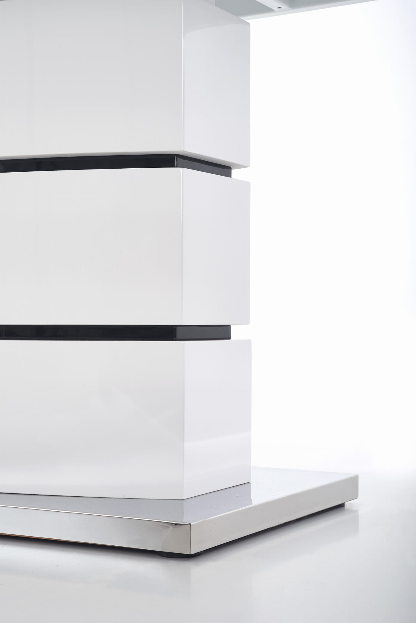 Stół NOBEL wykonany jest z lakierowanego MDF-u i stali nierdzewnej, co gwarantuje trwałość i wysoką jakość. Jego biała powierzchnia z czarnymi pasami nadaje mu wyjątkowego charakteru, idealnie wpisując się w nowoczesne i glamour wnętrza.