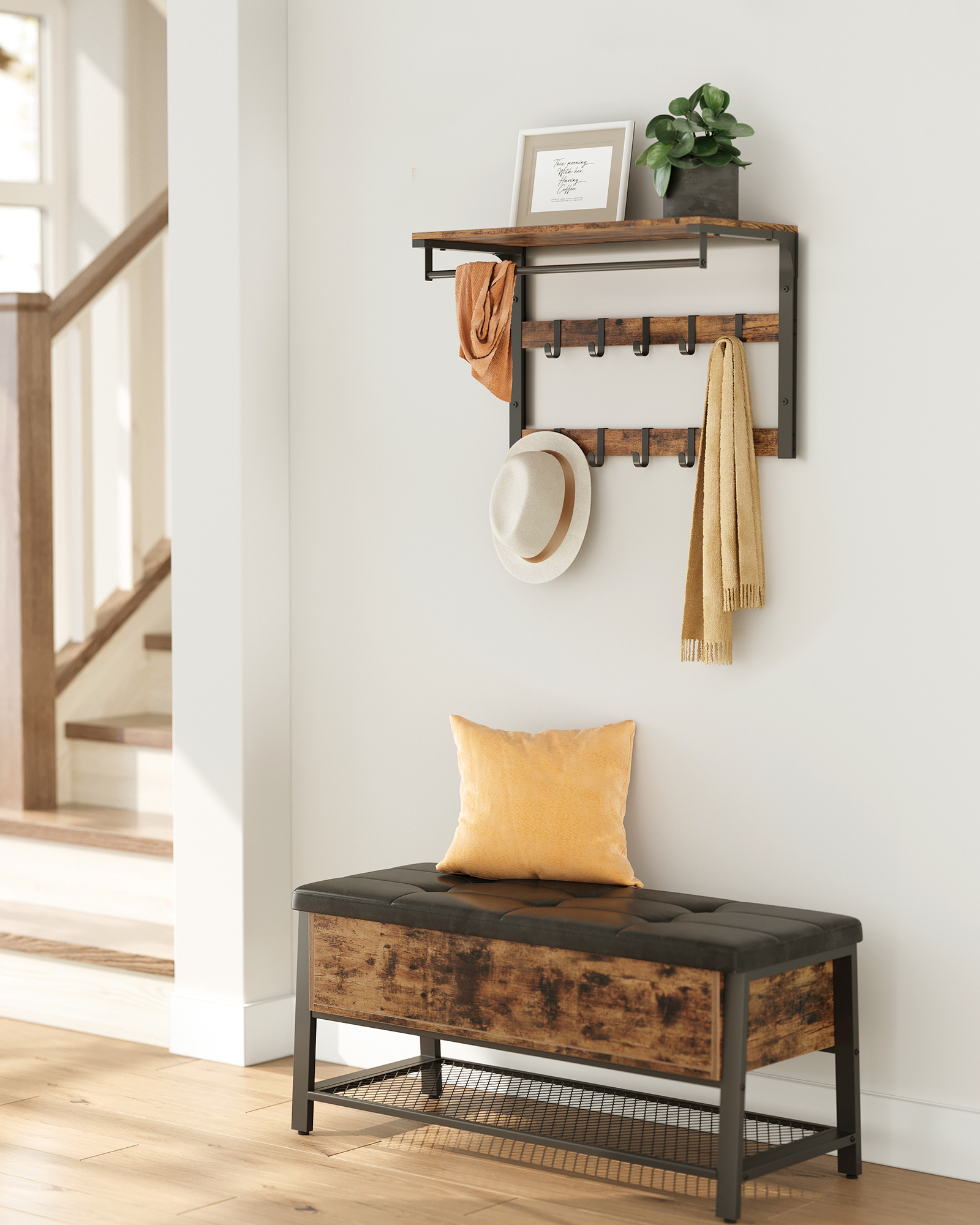 • Ten niewiele zajmujący miejsca produkt posiada stabilną półkę, na której możemy umieścić kwiaty doniczkowe, plecaki, kapelusze, czapki albo po prostu umieścić nasze pięknie oprawione zdjęcia.