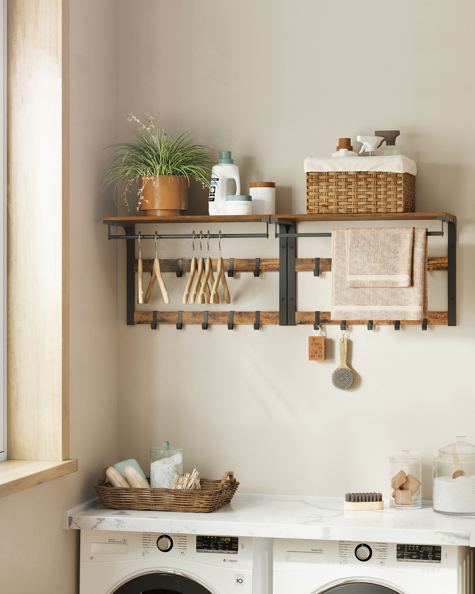 • Ponadto produkt został wyposażony w 10 haczyków do przechowywania płaszczy, kurtek, toreb czy też kluczy oraz stabilny drążek, na którym możemy wieszać kurtki i płaszcze umieszczone na wieszaku do ubrań.