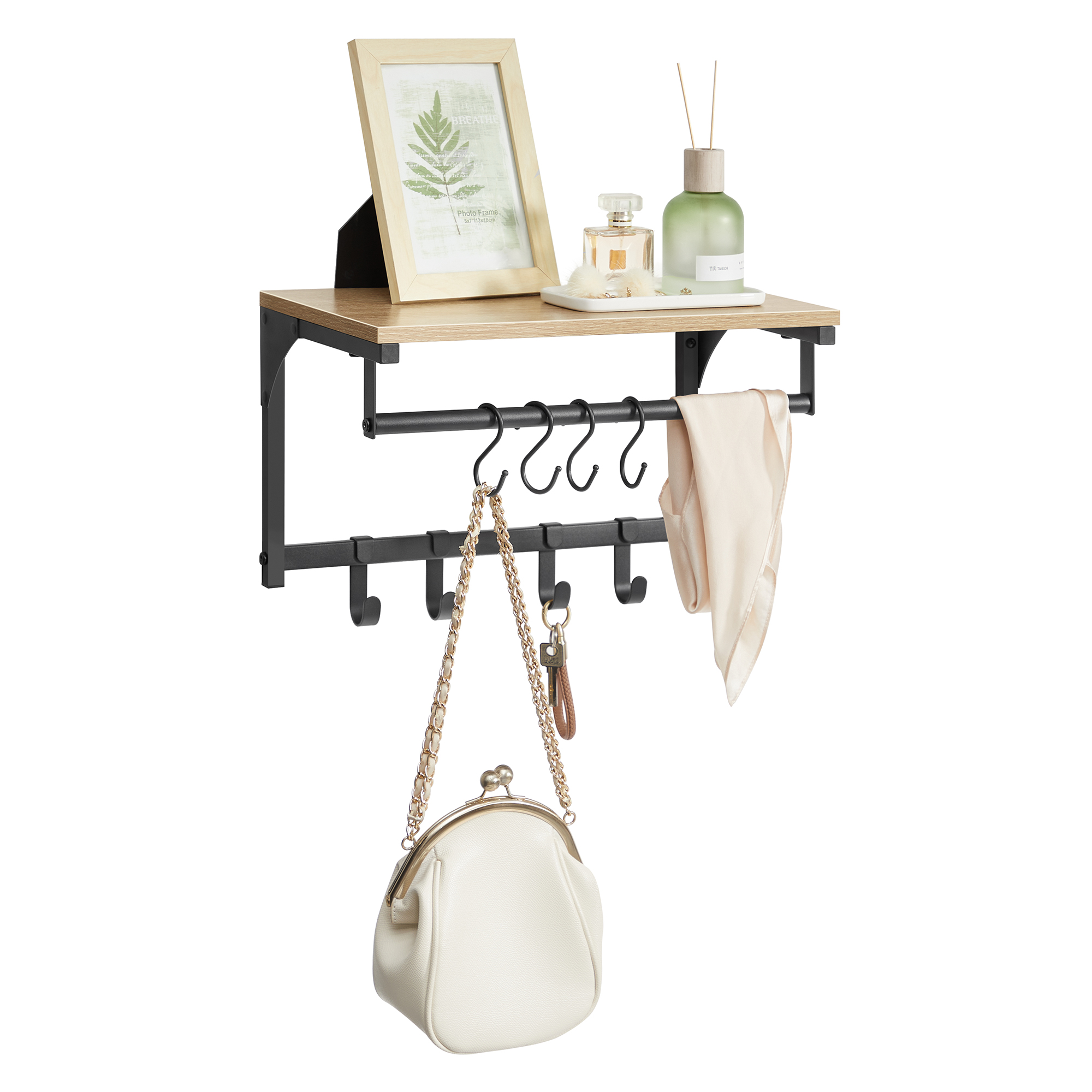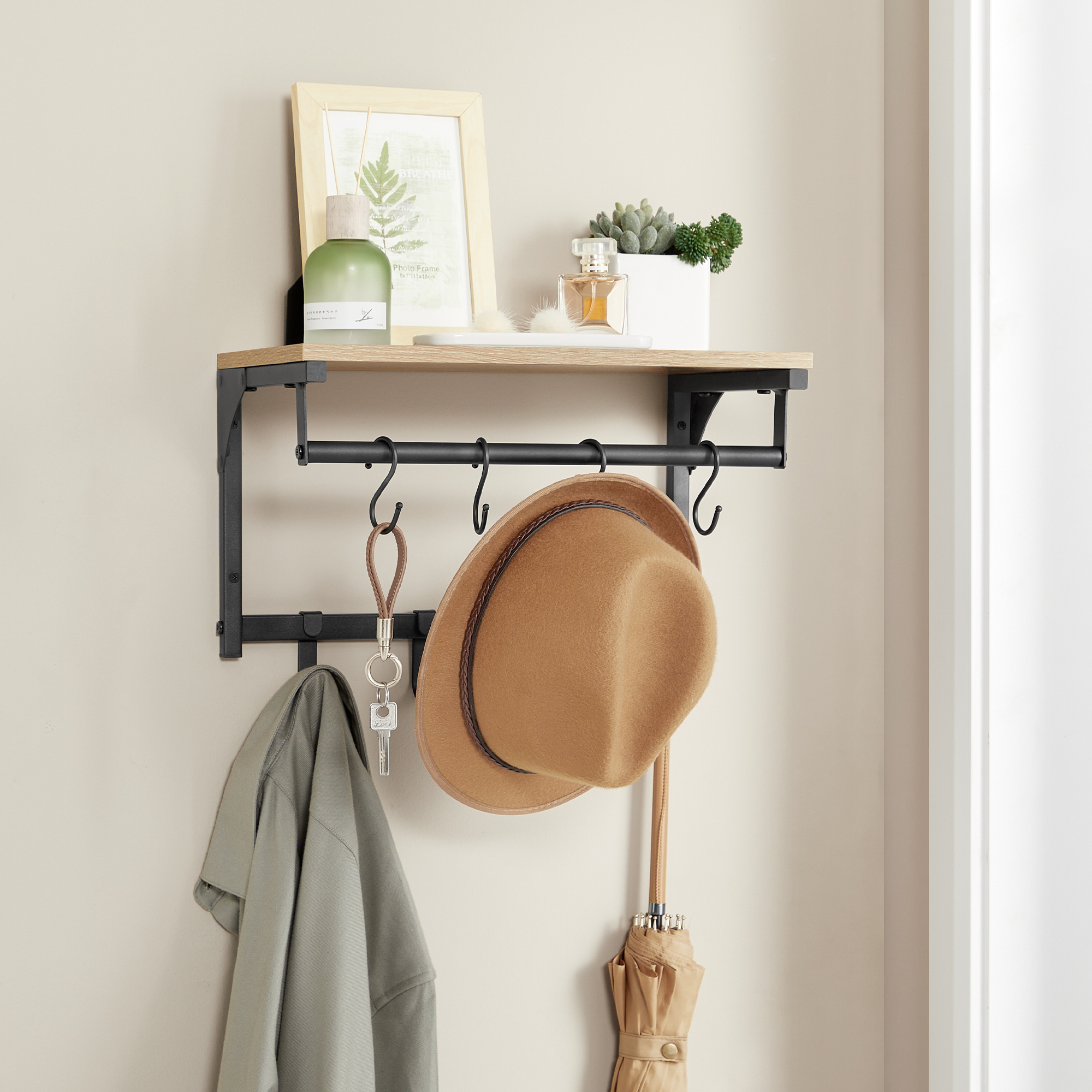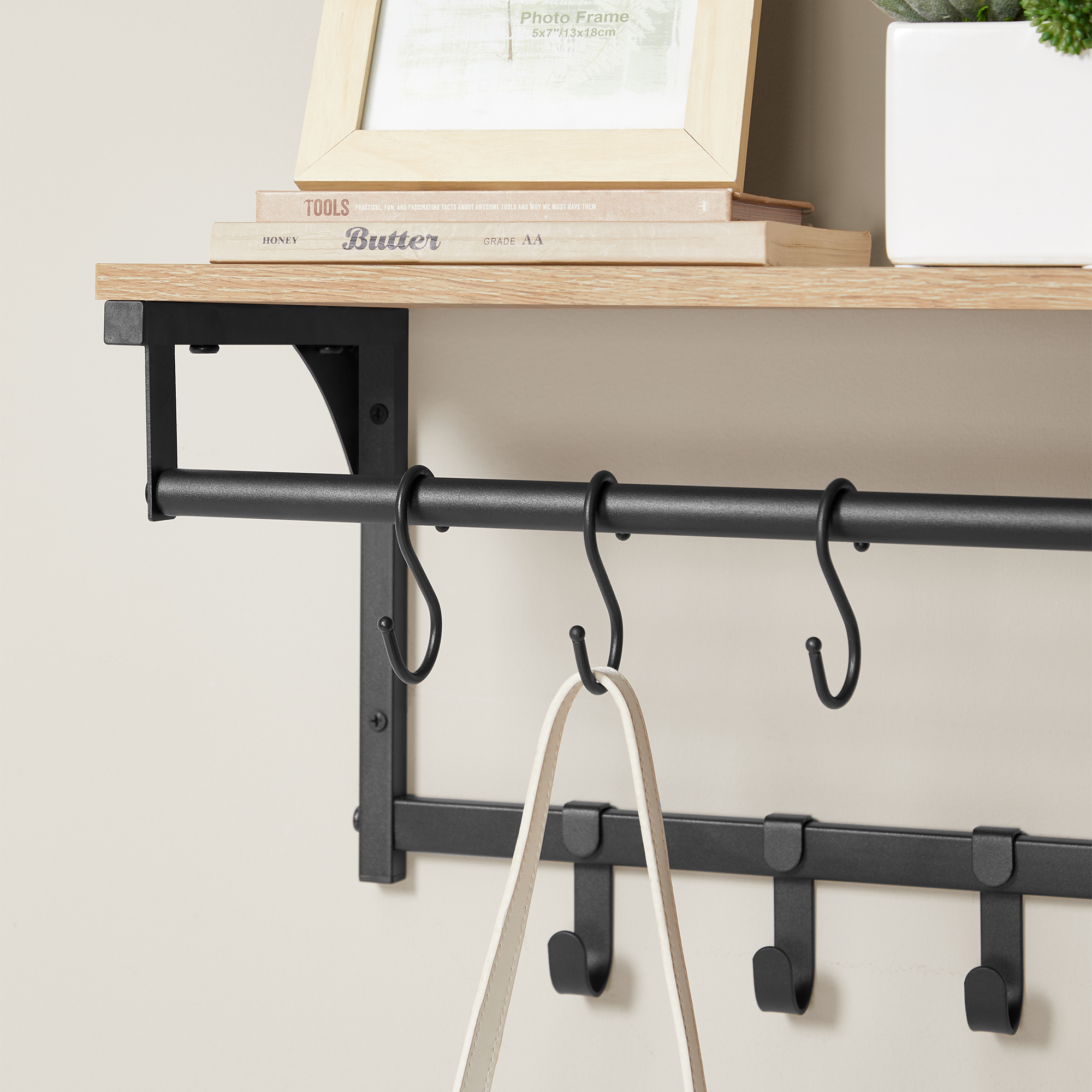 • Ponadto produkt został wyposażony w 8 haczyków do przechowywania płaszczy, kurtek, toreb czy też kluczy oraz stabilny drążek, na którym możemy wieszać kurtki i płaszcze umieszczone na wieszaku do ubrań.