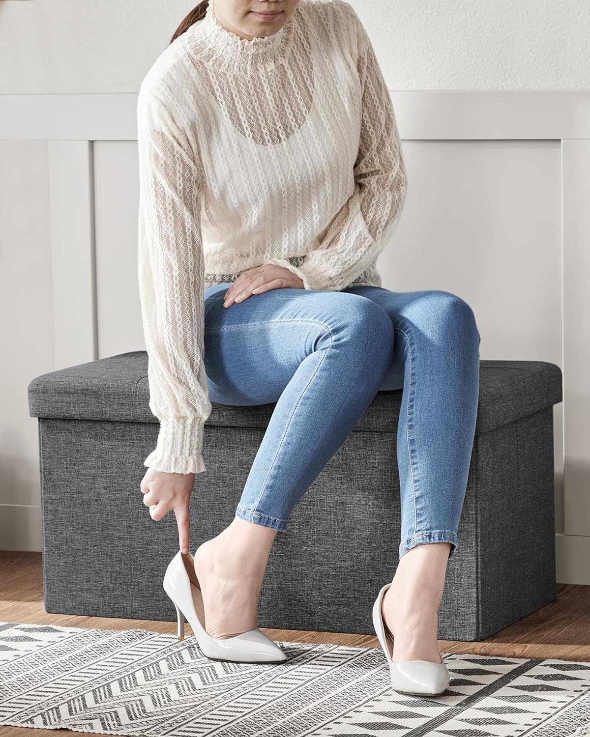 Na pufie można swobodnie usiąść i założyć obuwie czy skarpetki.