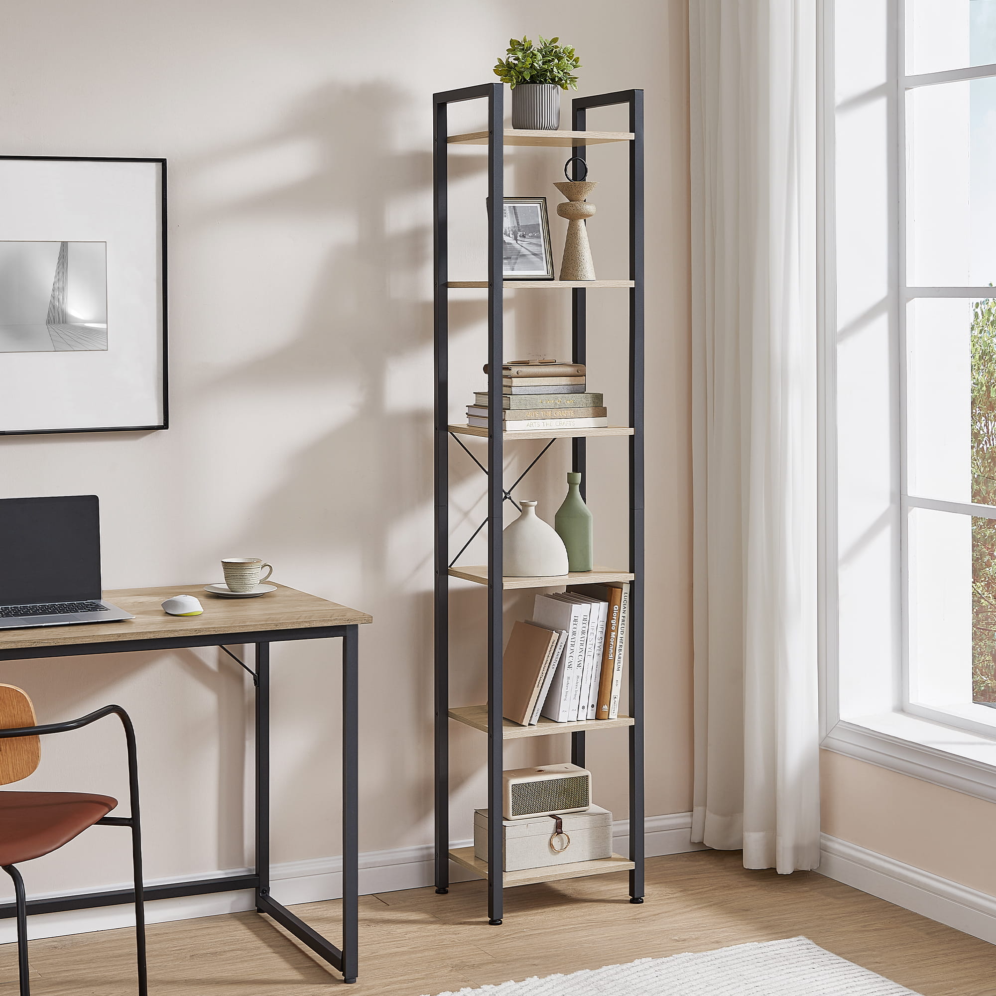 Regał cechuje się uniwersalnością oraz funkcjonalnością, będzie świetnie pasował do salonu, sypialni, przedpokoju, domowego gabinetu, a 6 półek ułatwi nam dostęp do ulubionych rzeczy.