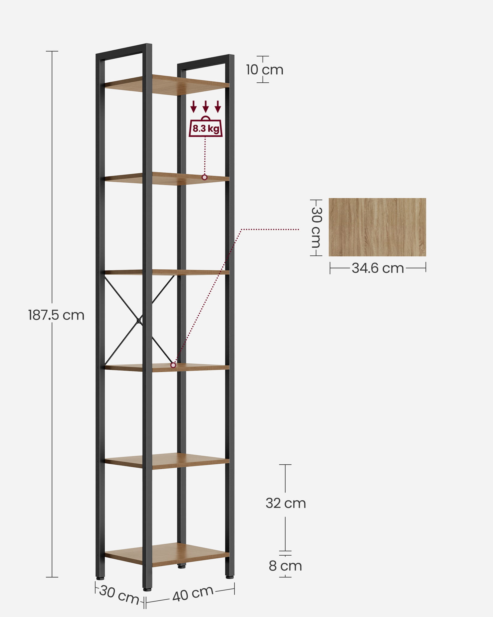 - Wymiary: 40 x 30 x 187,5 cm (szerokość x głębokość x wysokość)