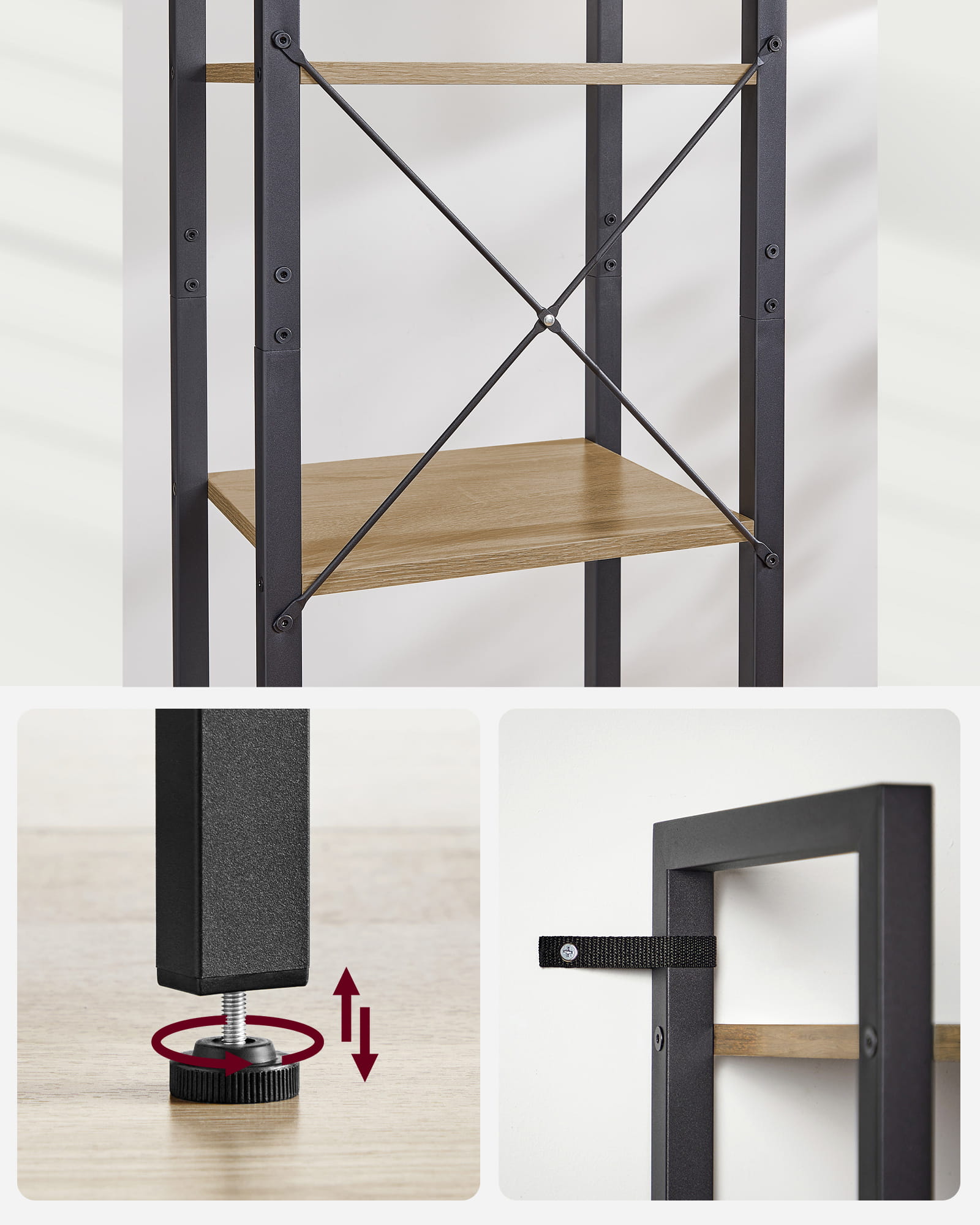 Zestaw zapobiegający przewróceniu zapobiega przewróceniu się regału, zapewniając bezpieczne użytkowanie.