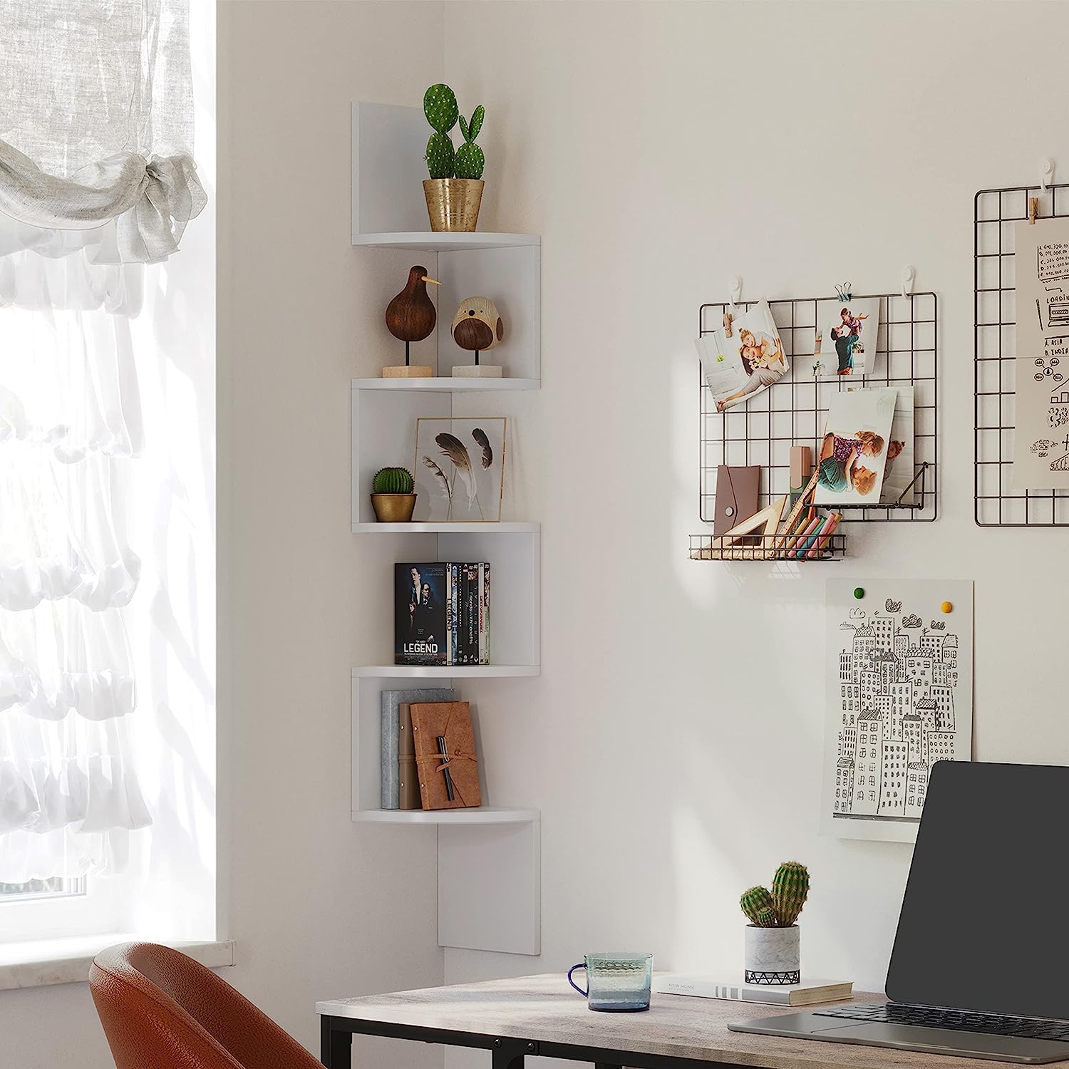 Regał wykonany w stylu nowoczesnym. Półki regału są stabilne, a więc możemy umieścić na nich książki, kwiaty w wazonach, ozdobne figurki oraz ramki ze zdjęciami. Regał cechuje się uniwersalnością oraz funkcjonalnością, będzie świetnie pasował do salonu, sypialni, przedpokoju, gabinetu, a 5 półek ułatwi nam dostęp do ulubionych rzeczy. Ten produkt pozwoli nam w pełni wykorzystać przestrzeń narożną. Półka na pewno wpasuje się w wystrój niejednego pomieszczenia. Idealnie spasowane elementy oraz neutralna oprawa regału nadadzą Twojemu wnętrzu wdzięku. Zadbaj o estetykę swojego salonu, sypialni, korytarza czy też biura wybierając produkty sprawdzone, o najwyższej jakości wykonania.