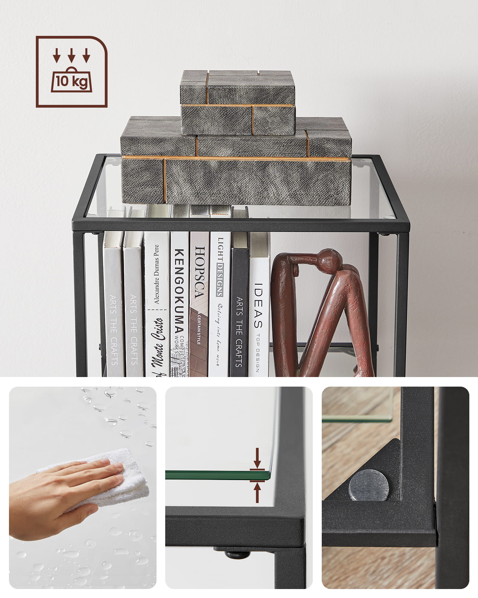 Idealnie spasowane elementy ramy oraz szklane półki nadadzą Twojemu wnętrzu wdzięku. Zadbaj o estetykę swojego salonu, pokoju, kuchni czy sypialni wybierając produkty sprawdzone, o najwyższej jakości wykonania.
