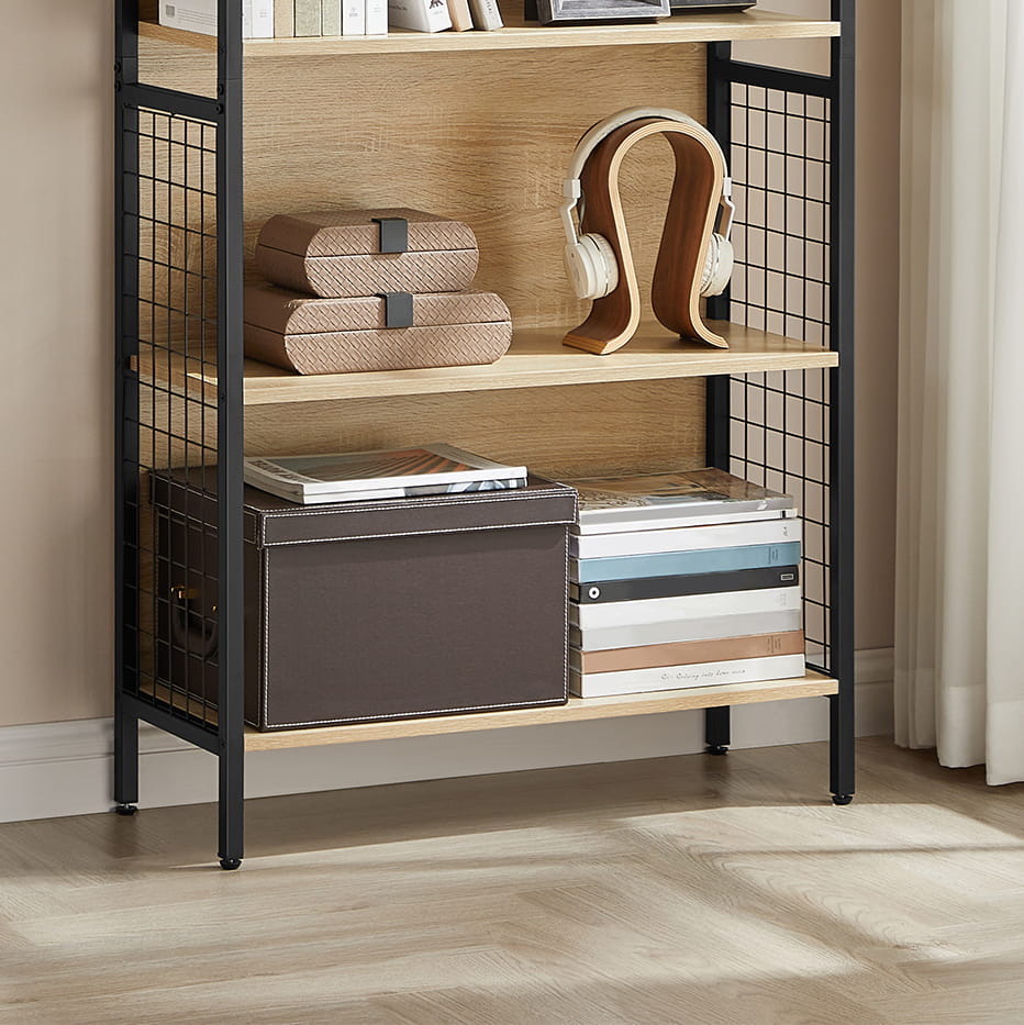 Półki stylowego regału w kolorze sonoma są stabilne, a więc możemy umieścić na nich książki, kwiaty w wazonach, ozdobne figurki, dziecięce zabawki oraz ramki ze zdjęciami.