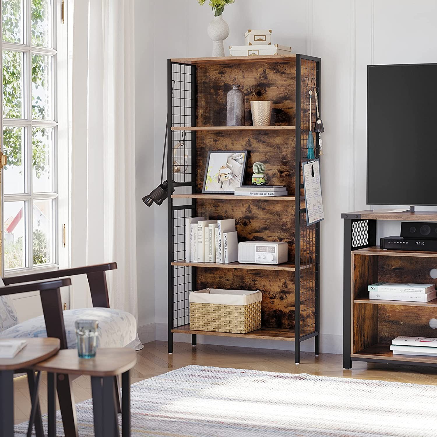 Na bocznych kratkach mebla można zawiesić 4 haki w kształcie litery S, które pozwolą na zawieszenie na regale przedmiotów, które chcemy mieć pod ręką, np. słuchawki.