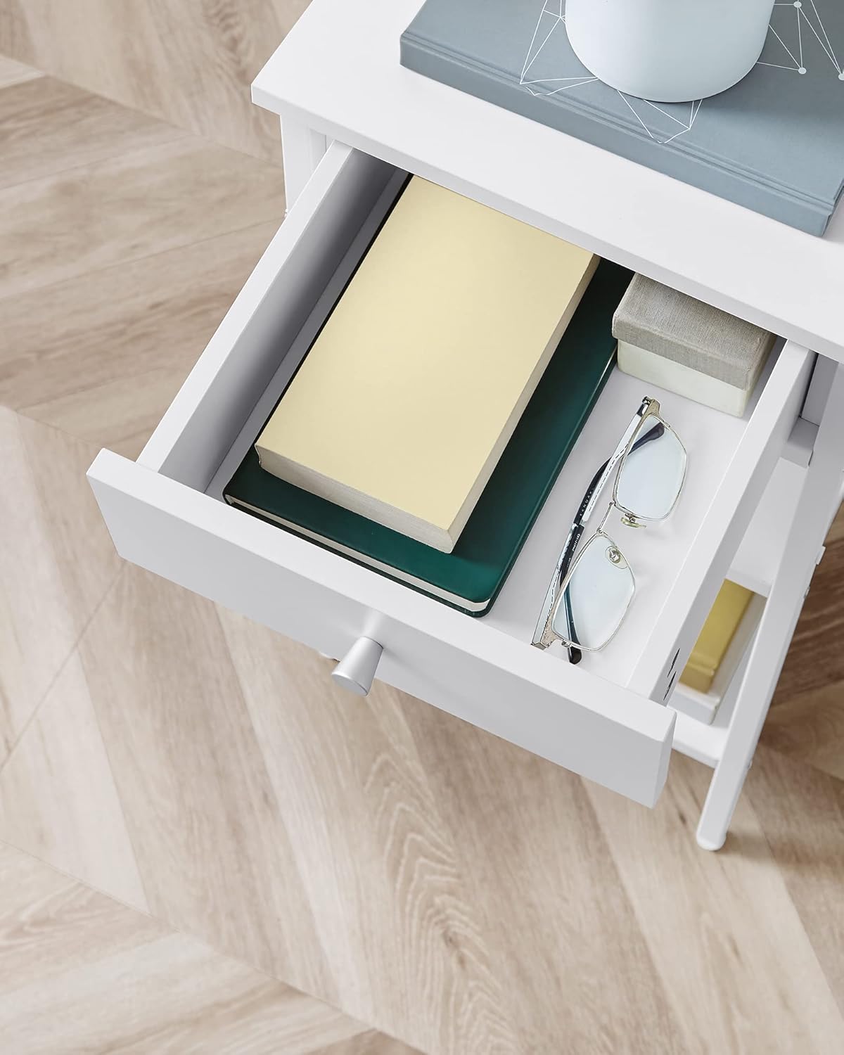 - Pojemna szuflada na drobiazgi - przechowasz w niej wszystko, co chcesz mieć pod ręką: ładowarkę, słuchawki, kosmetyki, książkę czy okulary.