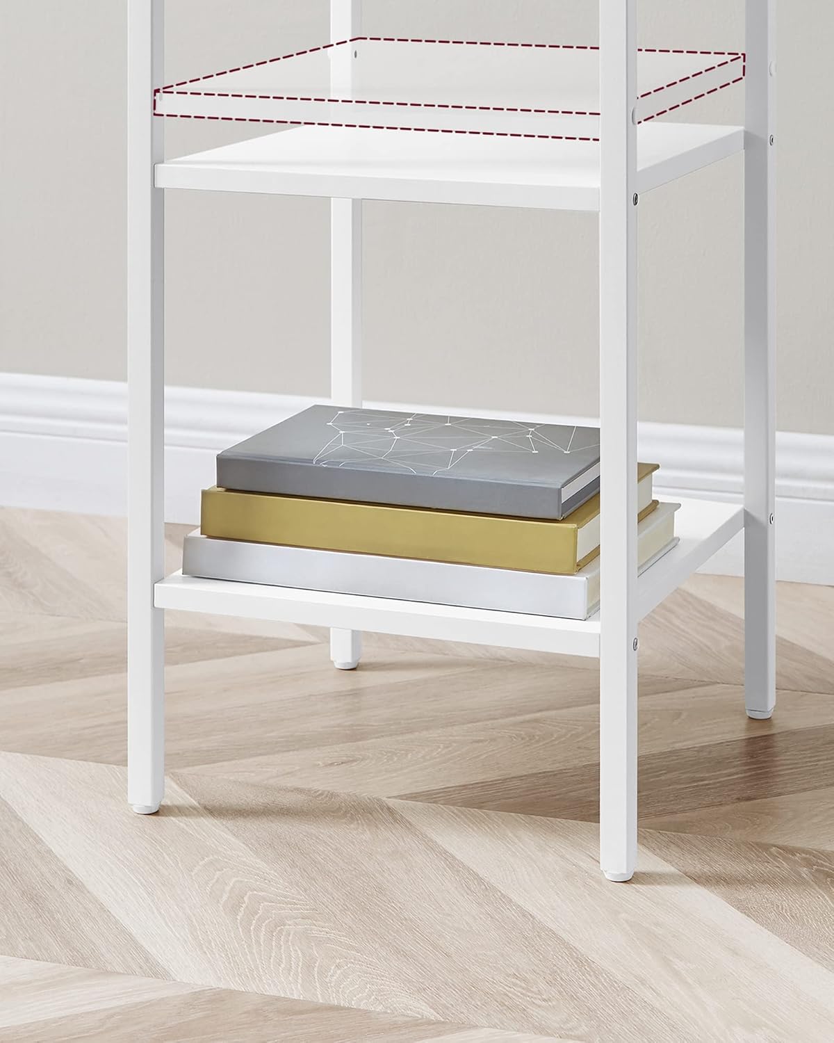 - Dwie otwarte półki – jeszcze więcej miejsca na książki i koszyk z akcesoriami.