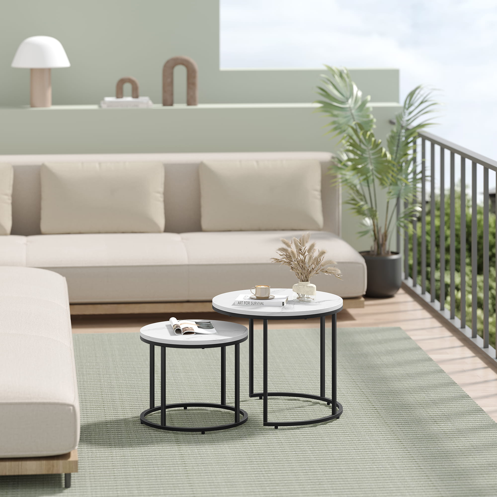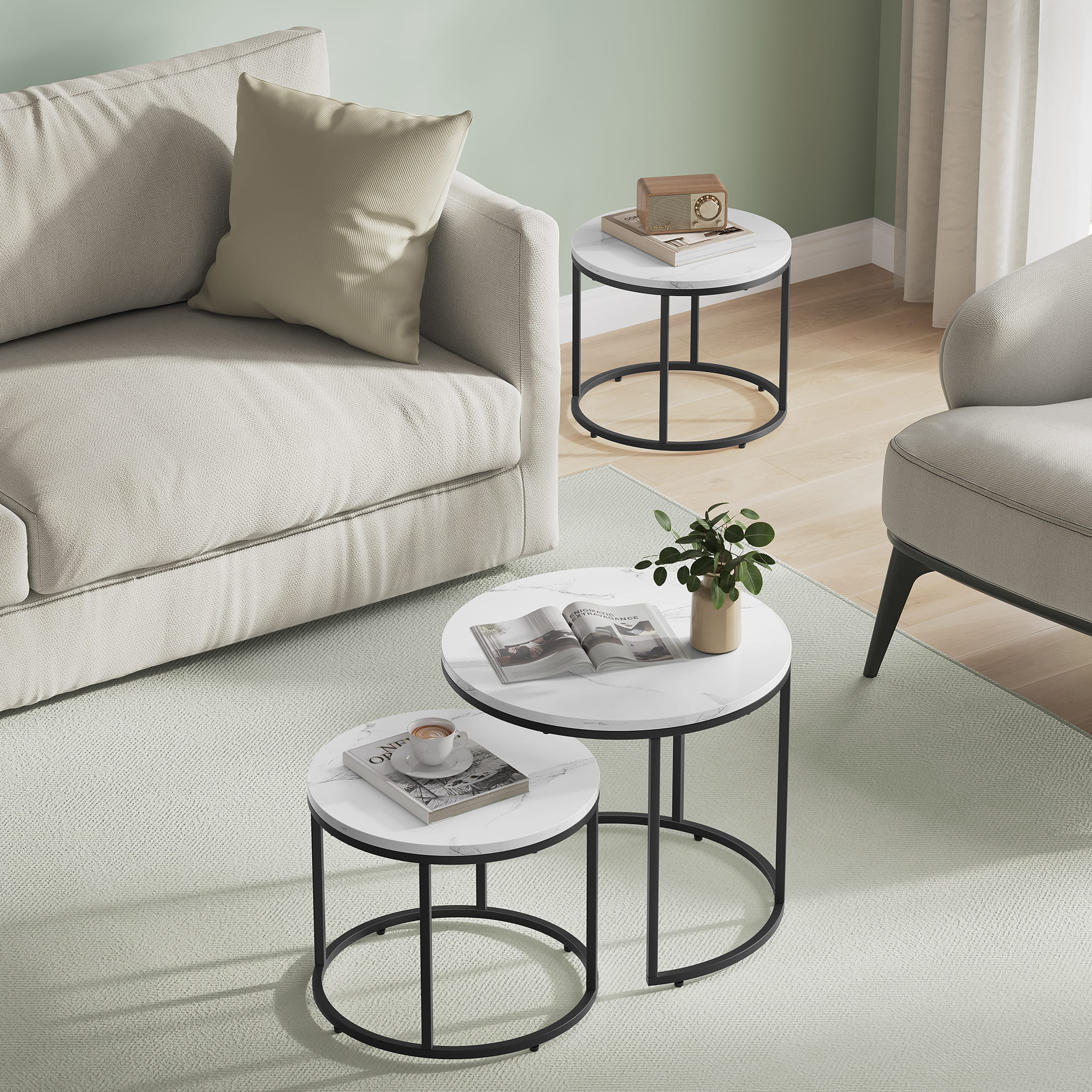 Stolik kawowy okrągły 2szt - marmur / nogi czarne, zestaw 53/45 43/35