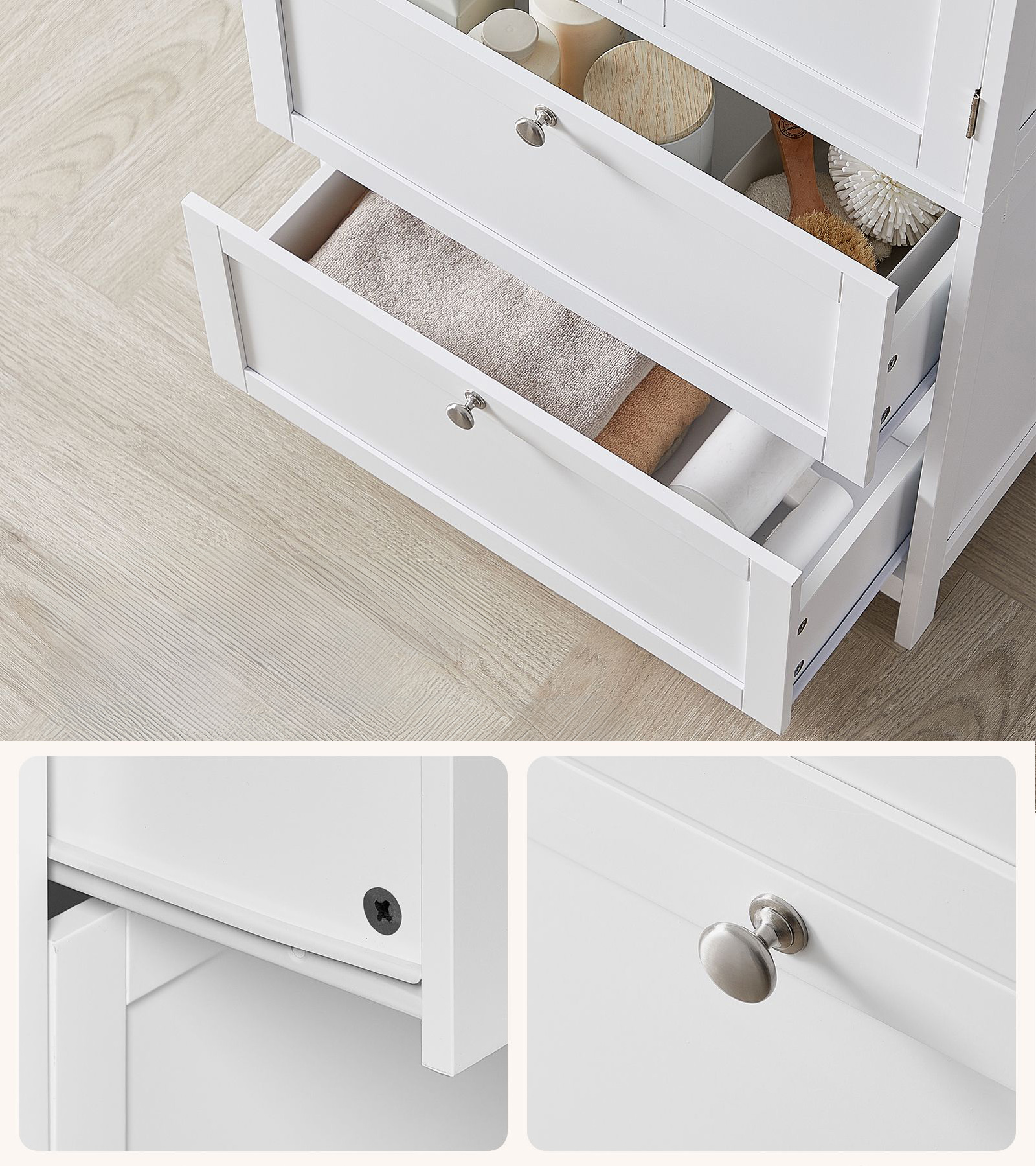 Komoda cechuje się uniwersalnością oraz funkcjonalnością, będzie świetnie pasowała nie tylko do łazienki, ale również do pralni, kuchni, sypialni, salonu oraz przedpokoju.