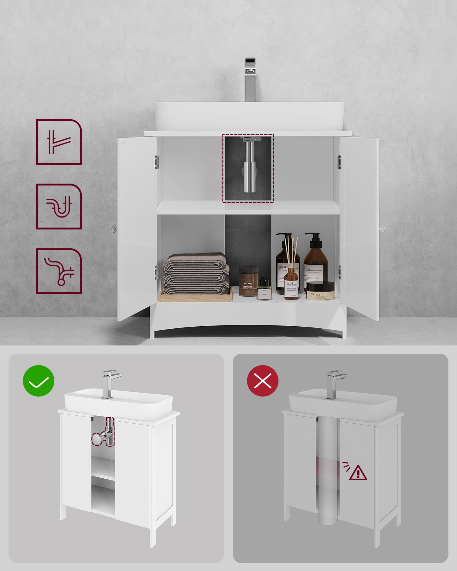 Dzięki wycięciu z tyłu szafki bez problemu dopasujesz różne rodzaje syfonu.