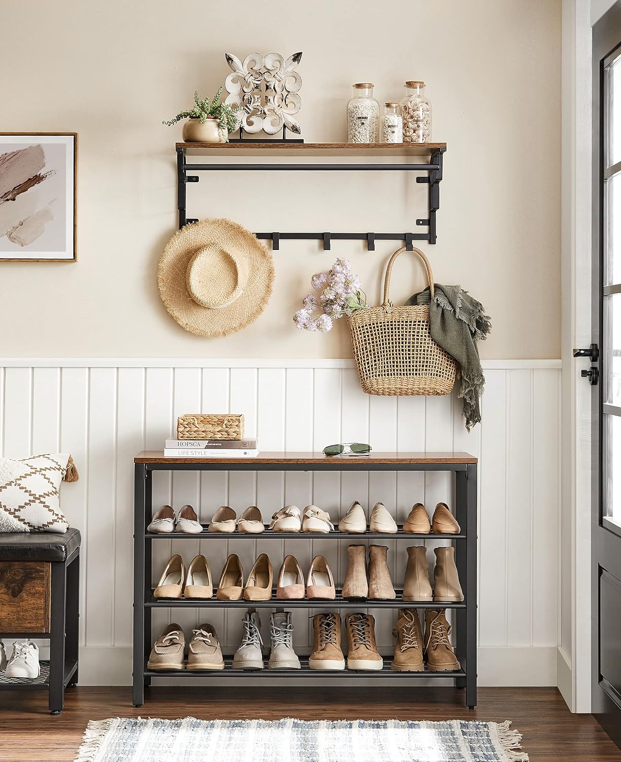 Industrialny regał na buty z półką to bardzo praktyczny i elegancki mebel, który znajdzie swoje zastosowanie w przedpokoju, korytarzu, biurze, recepcji, holu czy też w sklepie.