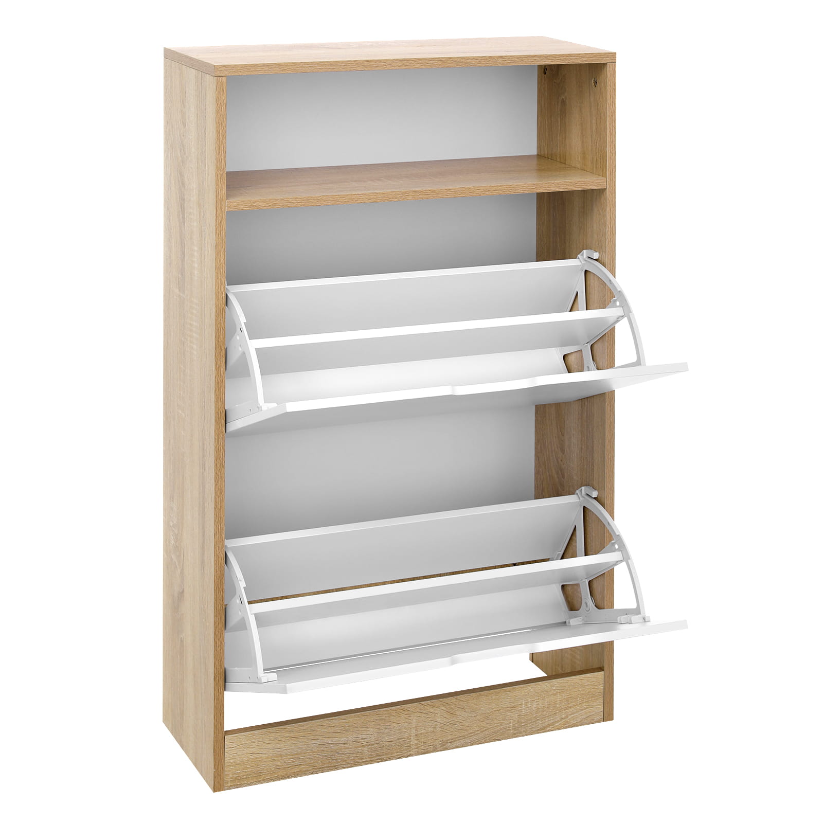 Szafka posiada 2 otwierane przegrody, w których znajduje się łącznie 4 głębokich półek na buty, które mogą pomieścić nawet do 12 par obuwia oraz 2 półki, na których możemy umieścić nasze pięknie oprawione zdjęcia, trofea czy ozdobne figurki i kwiaty w doniczkach.
