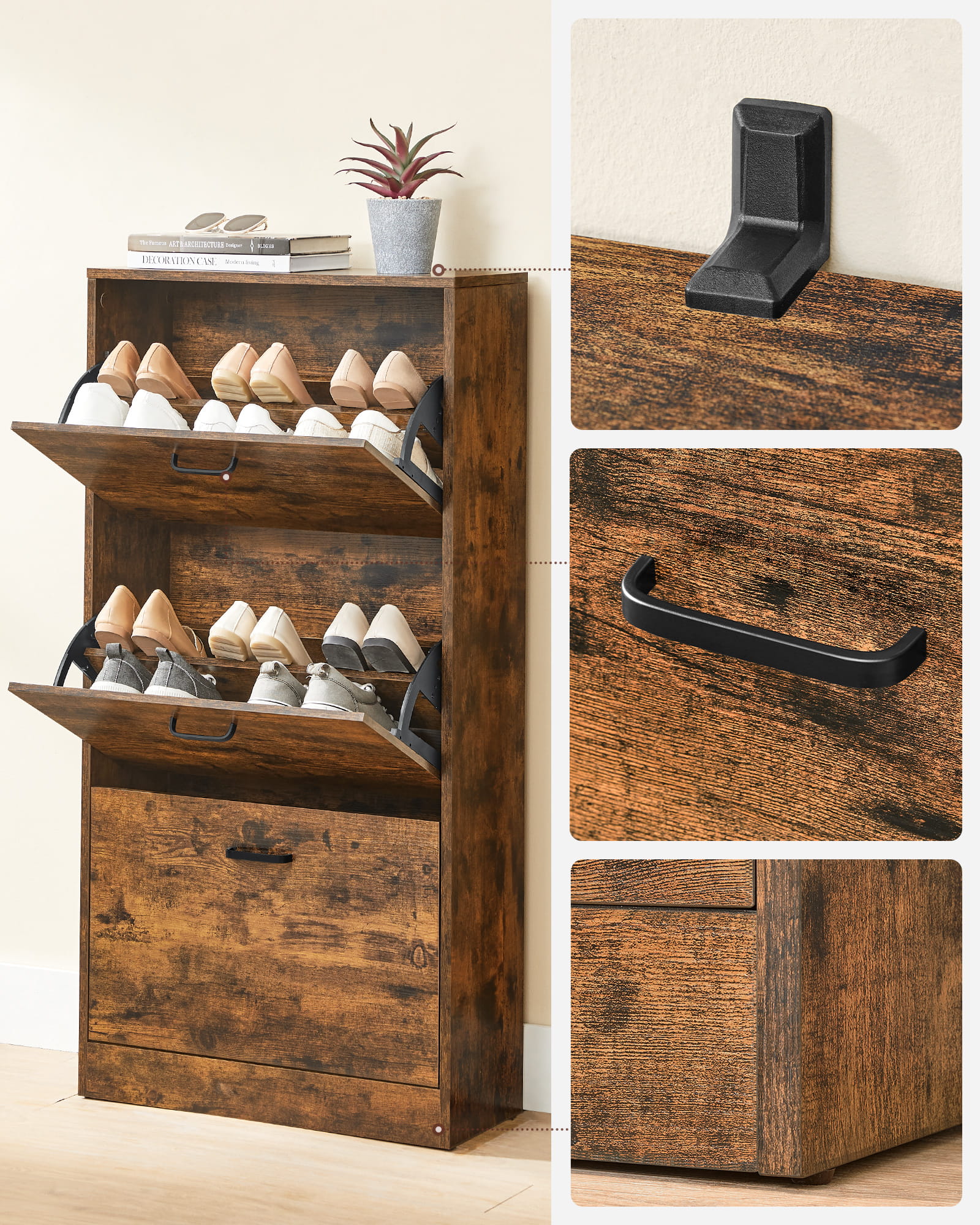 Szafka posiada 3 otwierane przegrody, w których znajduje się łącznie 6 głębokich półek na buty, które mogą pomieścić nawet do 18 par obuwia. Na górnym blacie możemy umieścić nasze pięknie oprawione zdjęcia, trofea czy ozdobne figurki i kwiaty w doniczkach.