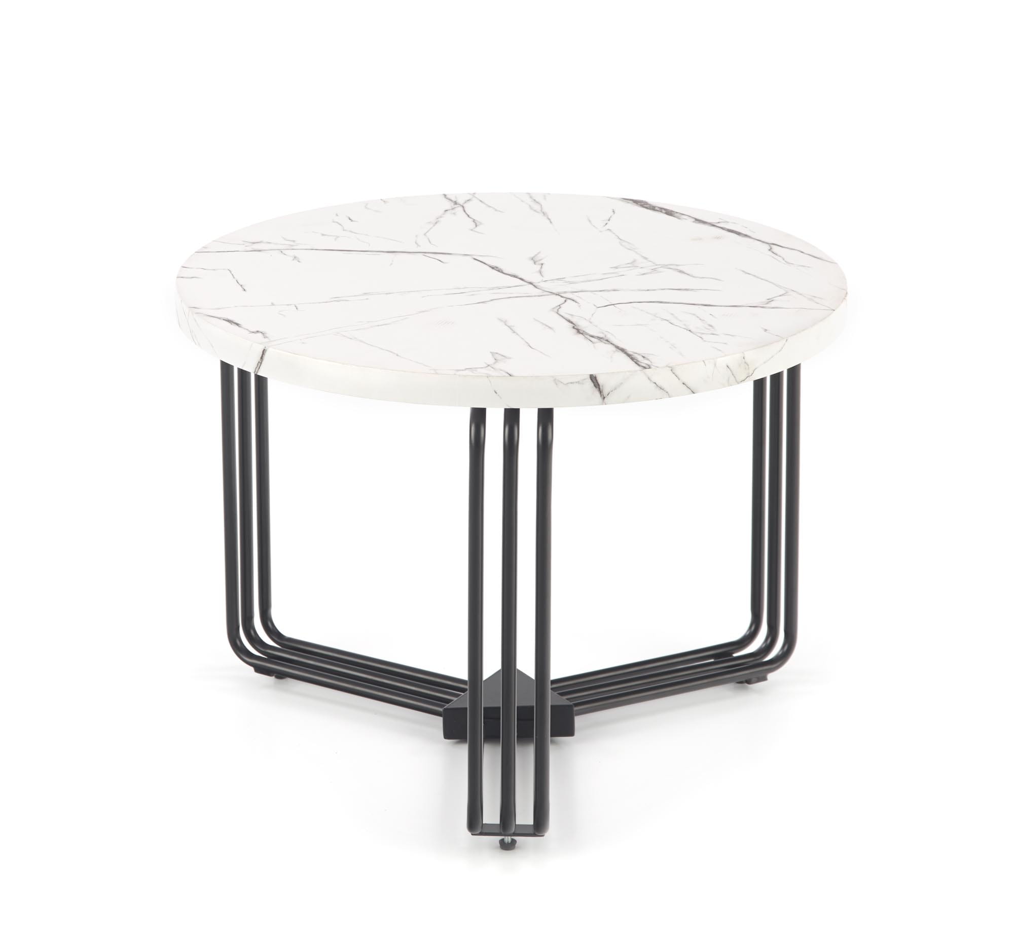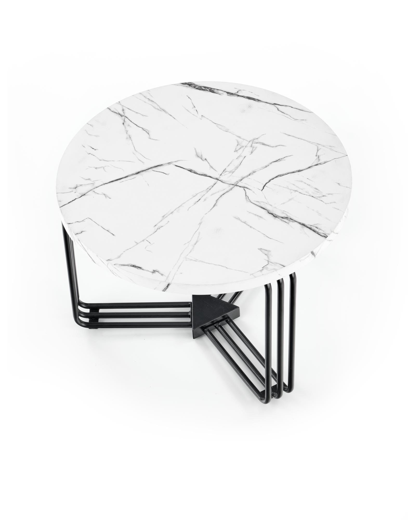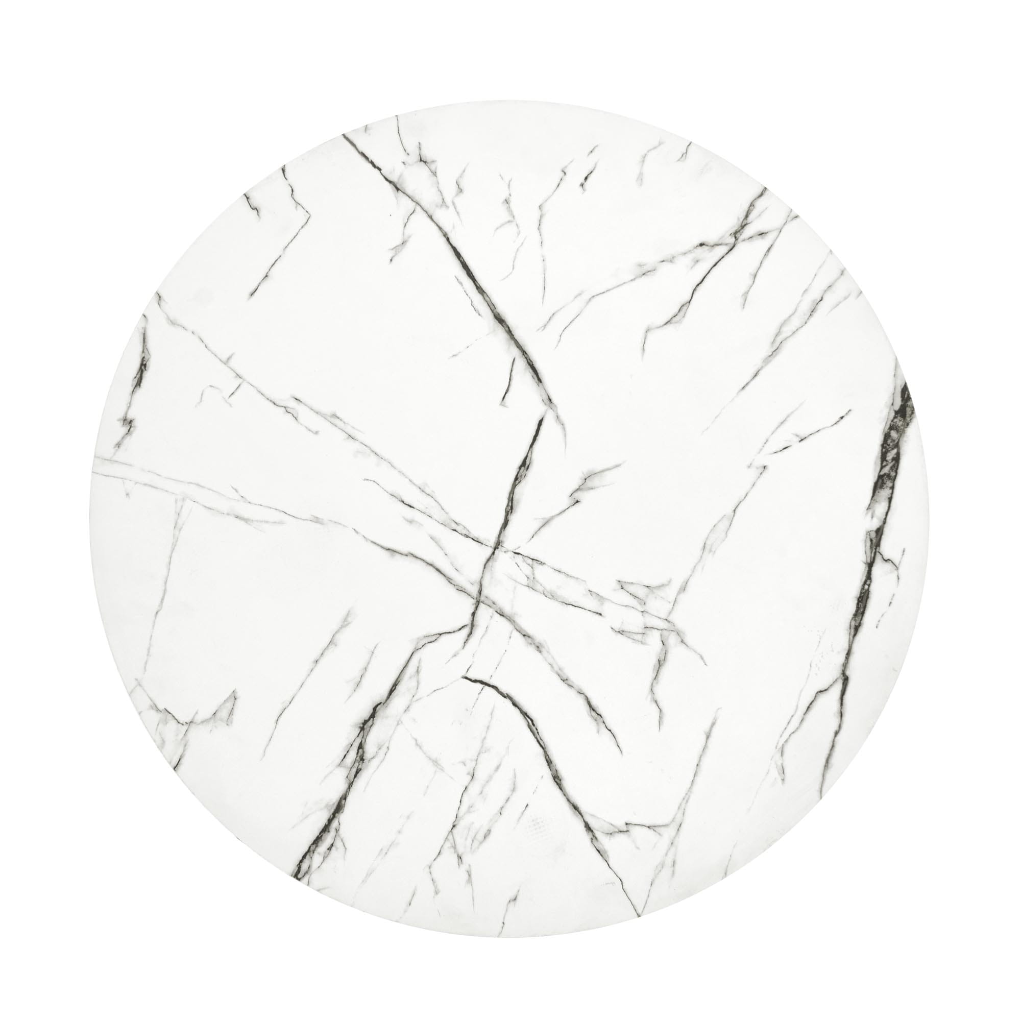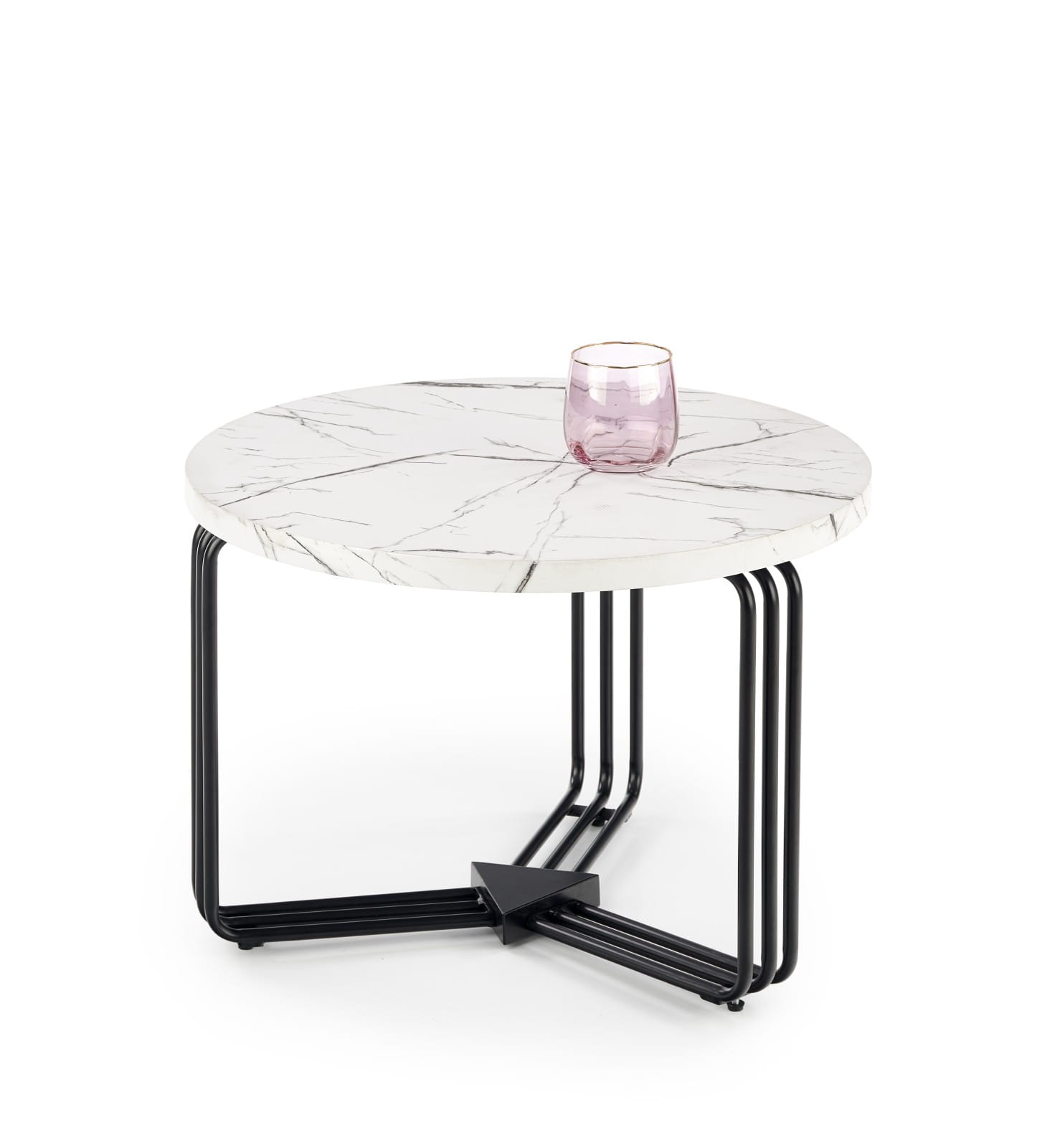 Jej okrągły blat o średnicy 55 cm w kolorze białego marmuru doskonale komponuje się z solidnym, czarnym stelażem o wysokości 41 cm.
