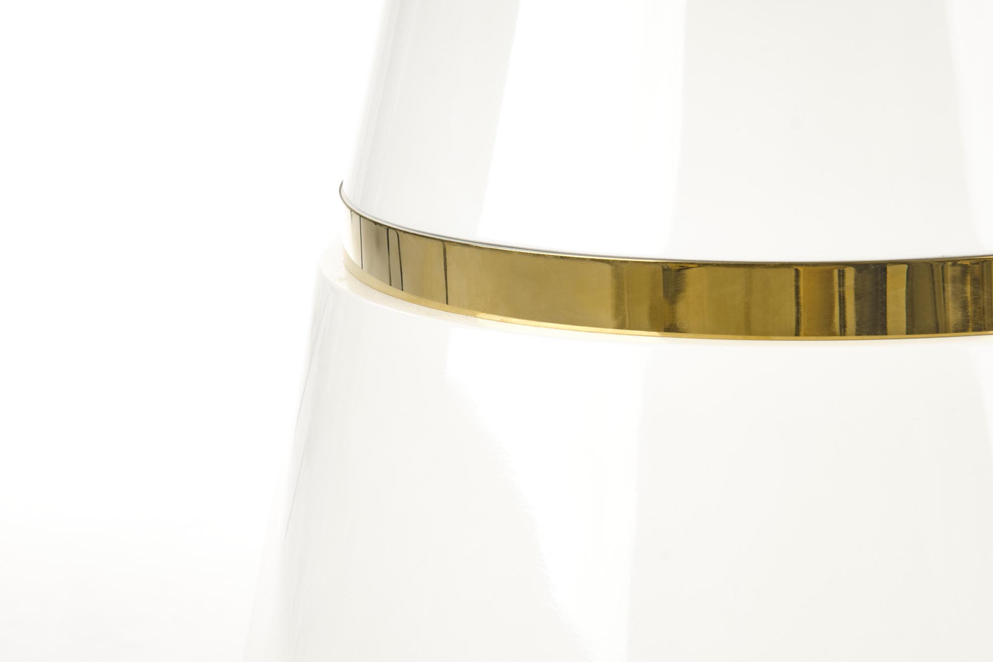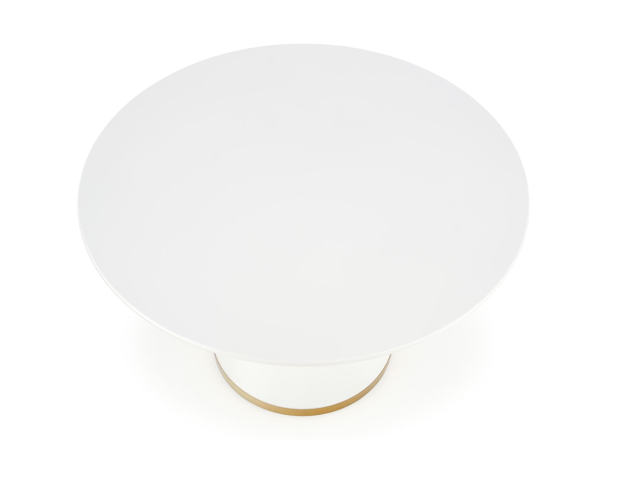 Jego okrągły blat o średnicy 120 cm wykonany z lakierowanego MDF'u w kolorze białym dodaje świeżości każdemu wnętrzu. Noga stołu, w kolorze biało-złotym -wykonana jest z chromowanej stali, co gwarantuje stabilność i trwałość.