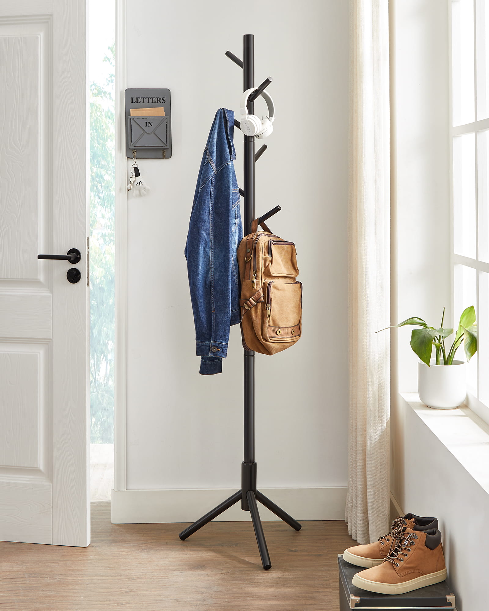 Ten niewiele zajmujący miejsca produkt posiada stabilną trójkątną podstawę, dzięki której mamy pewność, że produkt nie będzie się przechylał wraz z dodatkowym obciążeniem. Ponadto produkt został wyposażony w 8 haczyków do przechowywania płaszczy, kurtek, toreb czy też szali i czapek.