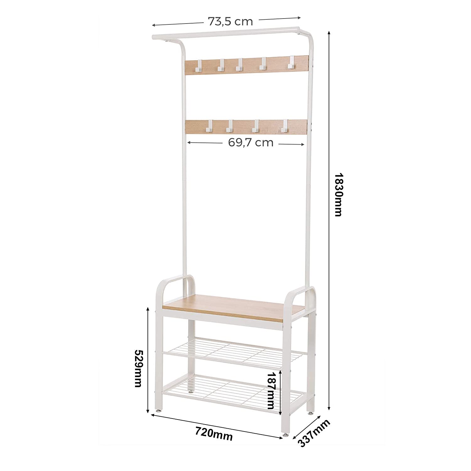 Pod wieszakiem znajdują się 2 wytrzymałe i pojemne półki na buty, które przyczynią się do uporządkowania obuwia w Twoim domu oraz siedzisko, które umożliwi nam jego sprawne założenie.