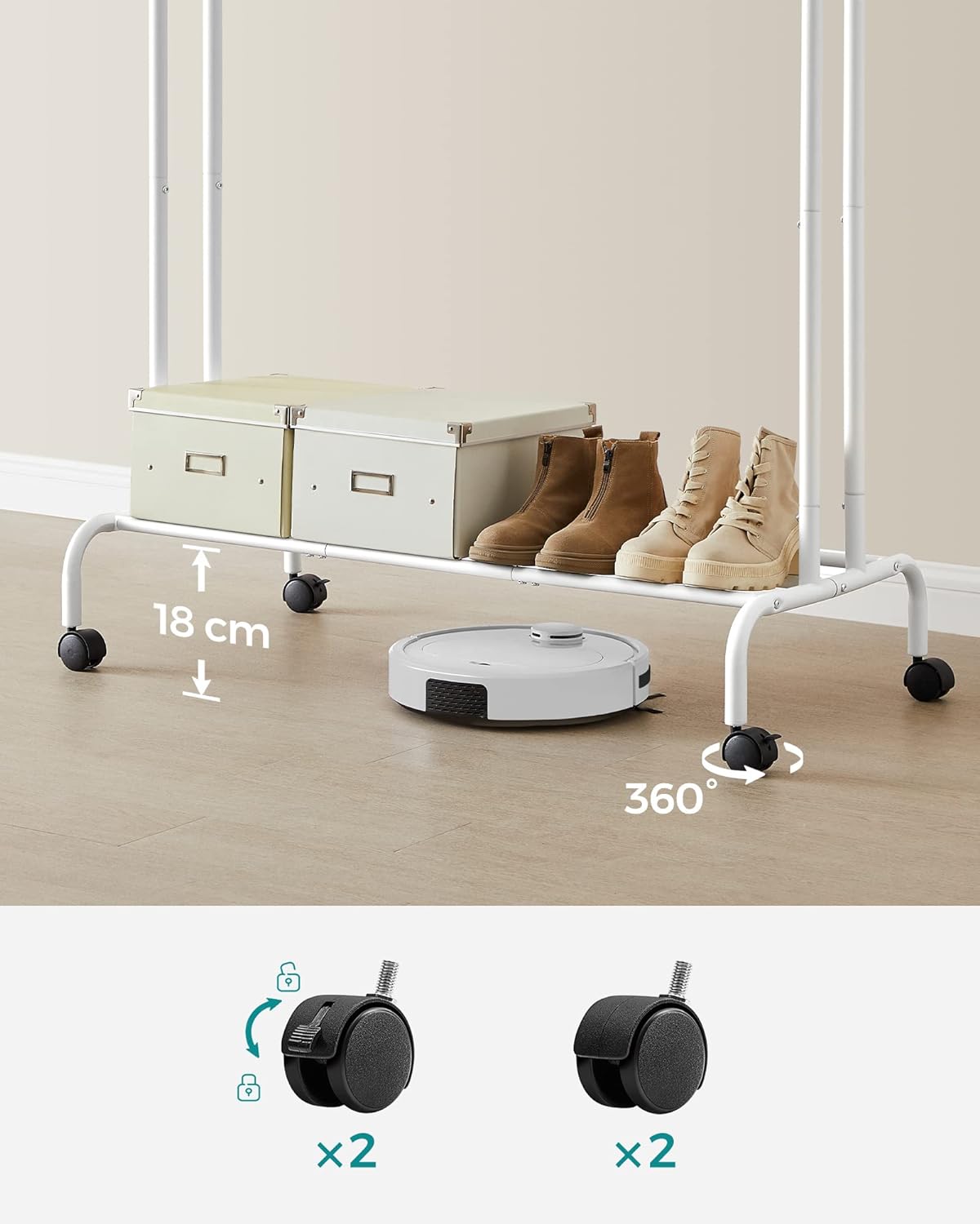 Wieszak posiada kółka, co czyni go niezwykle mobilnym. Dwa kółka posiadają możliwość ich blokady. Dobrze skrętne kółka sprawiają, że wieszak z łatwością możemy przemieścić w wybrane przez nas pomieszczenie. Chcesz przymierzyć sukienki przed randką czy ważnym spotkaniem biznesowym? Nic bardziej prostszego, po prostu przysuń wieszak do lustra i możesz przymierzyć to na co masz ochotę. Specjalnie zaprojektowana konstrukcja drążków sprawia, że ubrania swobodnie mieszczą się na obu drążkach. Zwiększona przestrzeń między drążkami ochroni ubrania przed zagnieceniem jak to bywa w przypadku innych wieszaków.