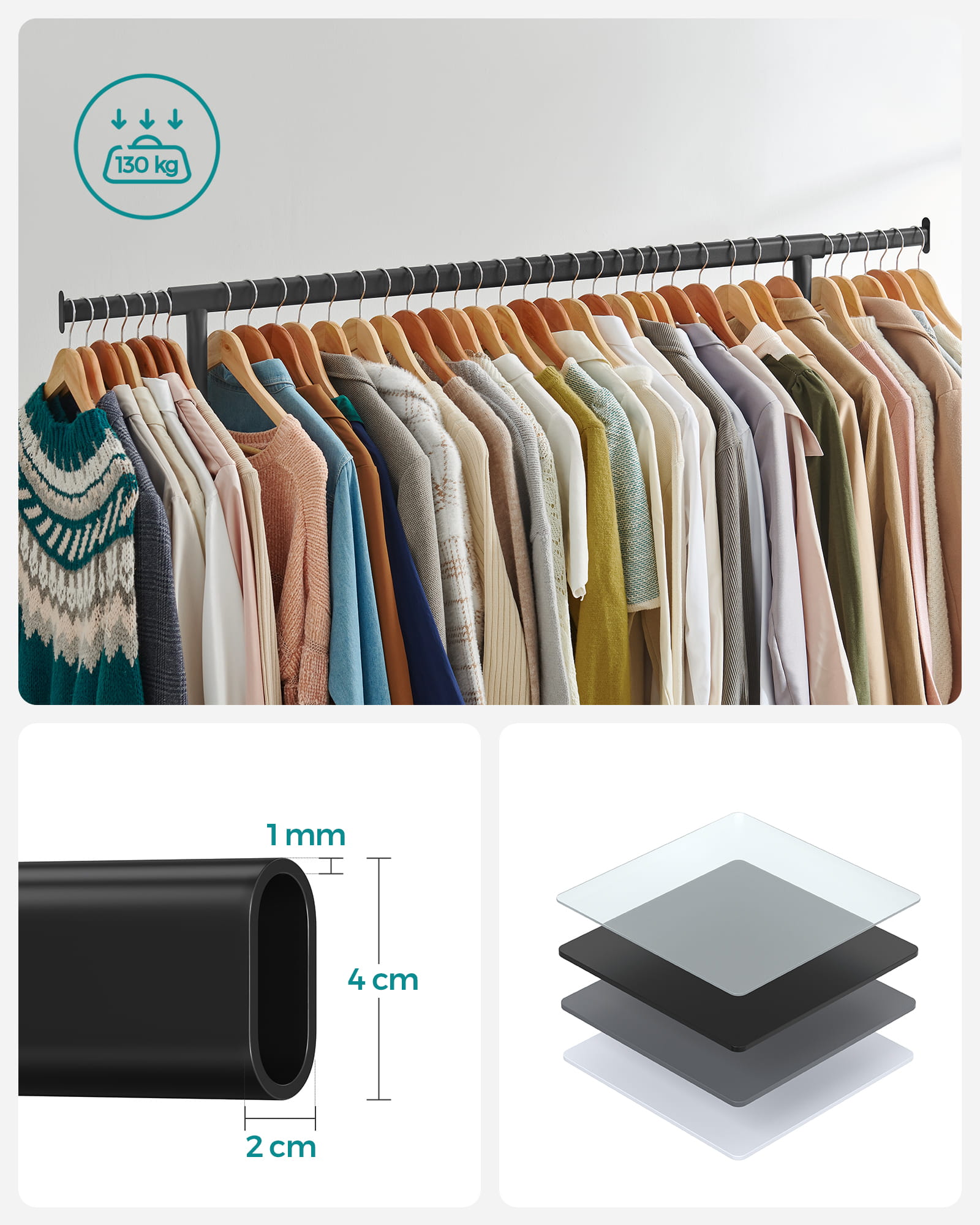 Stalowa konstrukcja zapewnia stabilność mebla, dlatego jest to idealny produkt na każdą porę roku, szczególnie docenimy go w sezonie zimowym, gdy zawiesimy na nim ciężkie kurtki i płaszcze. Na drążku swoje miejsce znajdą również wyprasowane koszule i sukienki okolicznościowe.