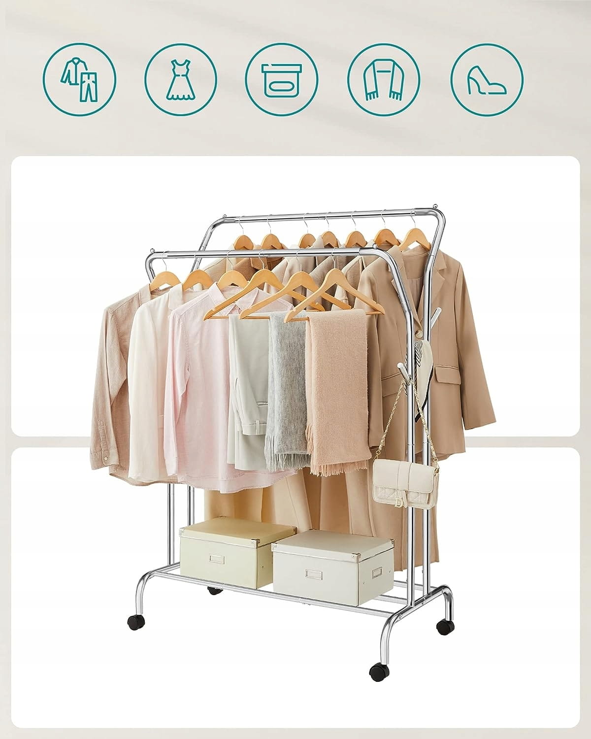 WIESZAK STOJAK NA UBRANIA NA KÓŁKACH, PODWÓJNY, SREBRNY