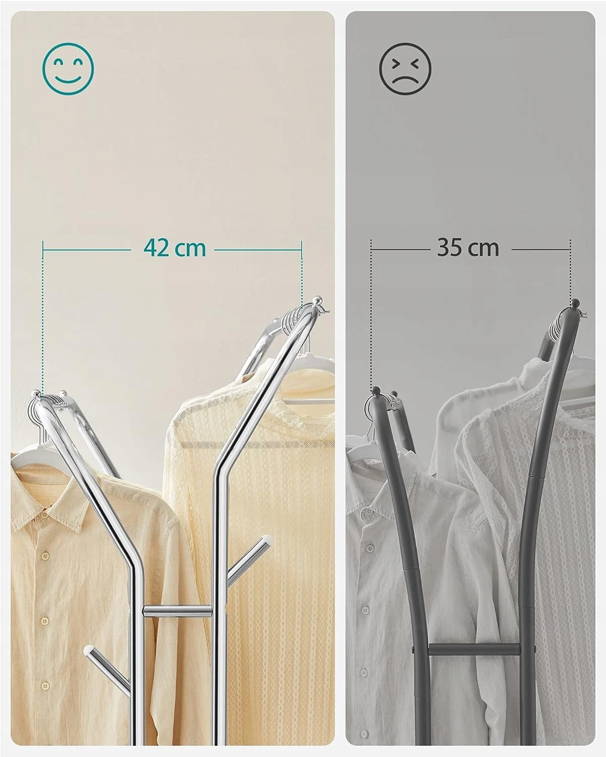 Wieszak posiada kółka, co czyni go niezwykle mobilnym. Dwa kółka posiadają możliwość ich blokady. Dobrze skrętne kółka sprawiają, że wieszak z łatwością możemy przemieścić w wybrane przez nas pomieszczenie. Chcesz przymierzyć sukienki przed randką czy ważnym spotkaniem biznesowym? Nic bardziej prostszego, po prostu przysuń wieszak do lustra i możesz przymierzyć to na co masz ochotę. Specjalnie zaprojektowana konstrukcja drążków sprawia, że ubrania swobodnie mieszczą się na obu drążkach. Zwiększona przestrzeń między drążkami ochroni ubrania przed zagnieceniem jak to bywa w przypadku innych wieszaków.