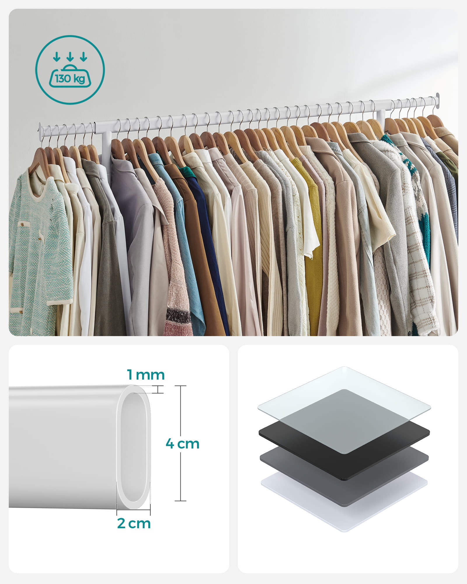 Stalowa konstrukcja zapewnia stabilność mebla, dlatego jest to idealny produkt na każdą porę roku, szczególnie docenimy go w sezonie zimowym, gdy zawiesimy na nim ciężkie kurtki i płaszcze. Na drążku swoje miejsce znajdą również wyprasowane koszule i sukienki okolicznościowe.