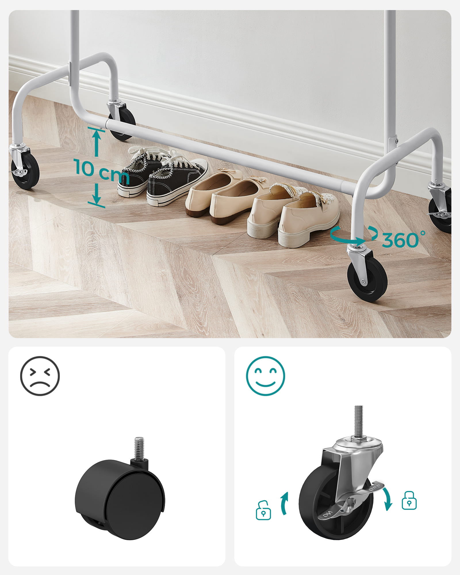 Wieszak posiada kółka, co czyni go niezwykle mobilnym. Dwa kółka posiadają możliwość ich blokady. Duże i dobrze skrętne kółka sprawiają, że wieszak z łatwością możemy przemieścić w wybrane przez nas pomieszczenie. Chcesz przymierzyć sukienki przed randką czy ważnym spotkaniem biznesowym? Nic bardziej prostszego, po prostu przysuń wieszak do lustra i możesz przymierzyć to na co masz ochotę.