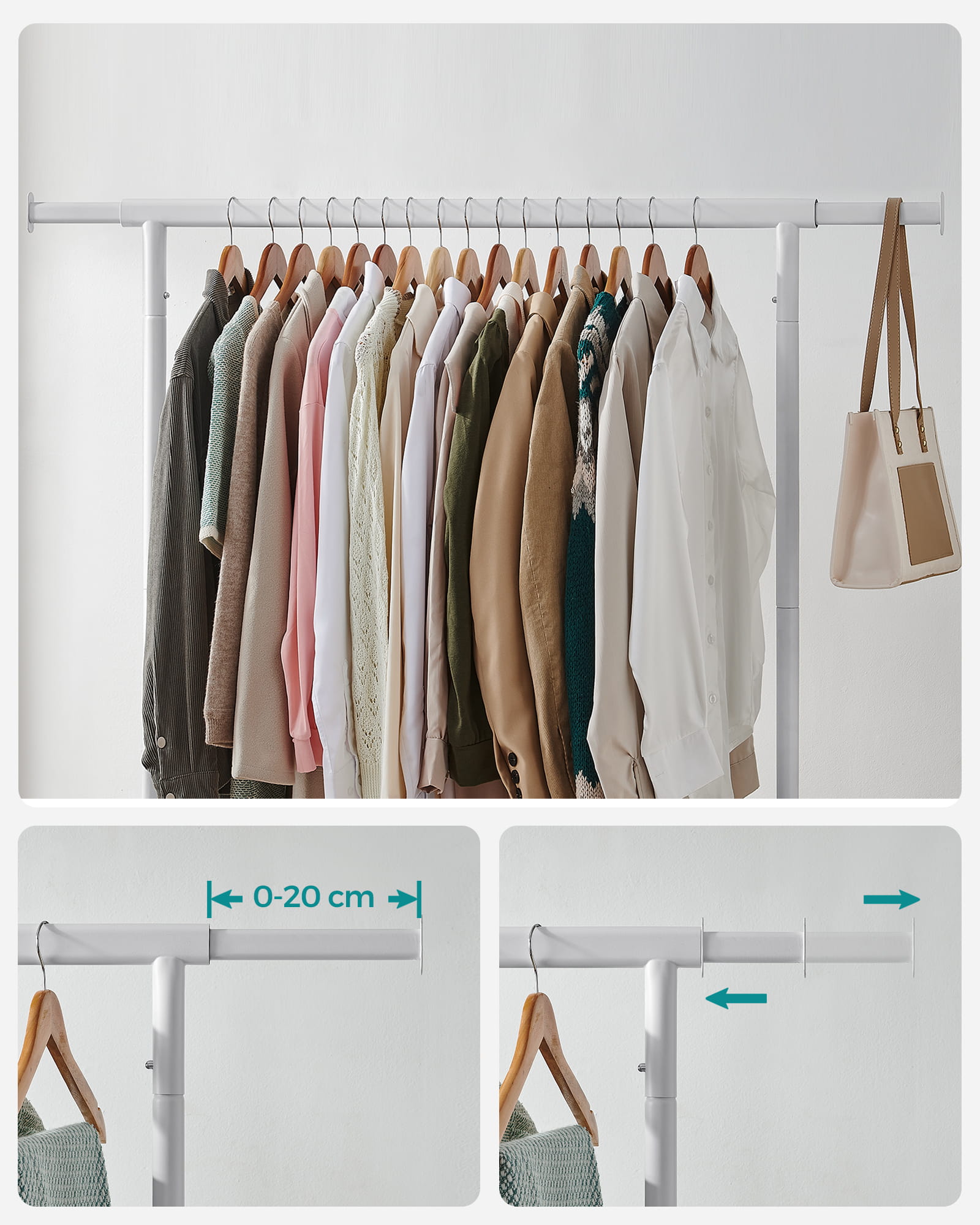 Możliwość wysunięcia drążka o 20 cm z każdej strony daje nam dodatkową powierzchnie na wieszane ubrania.