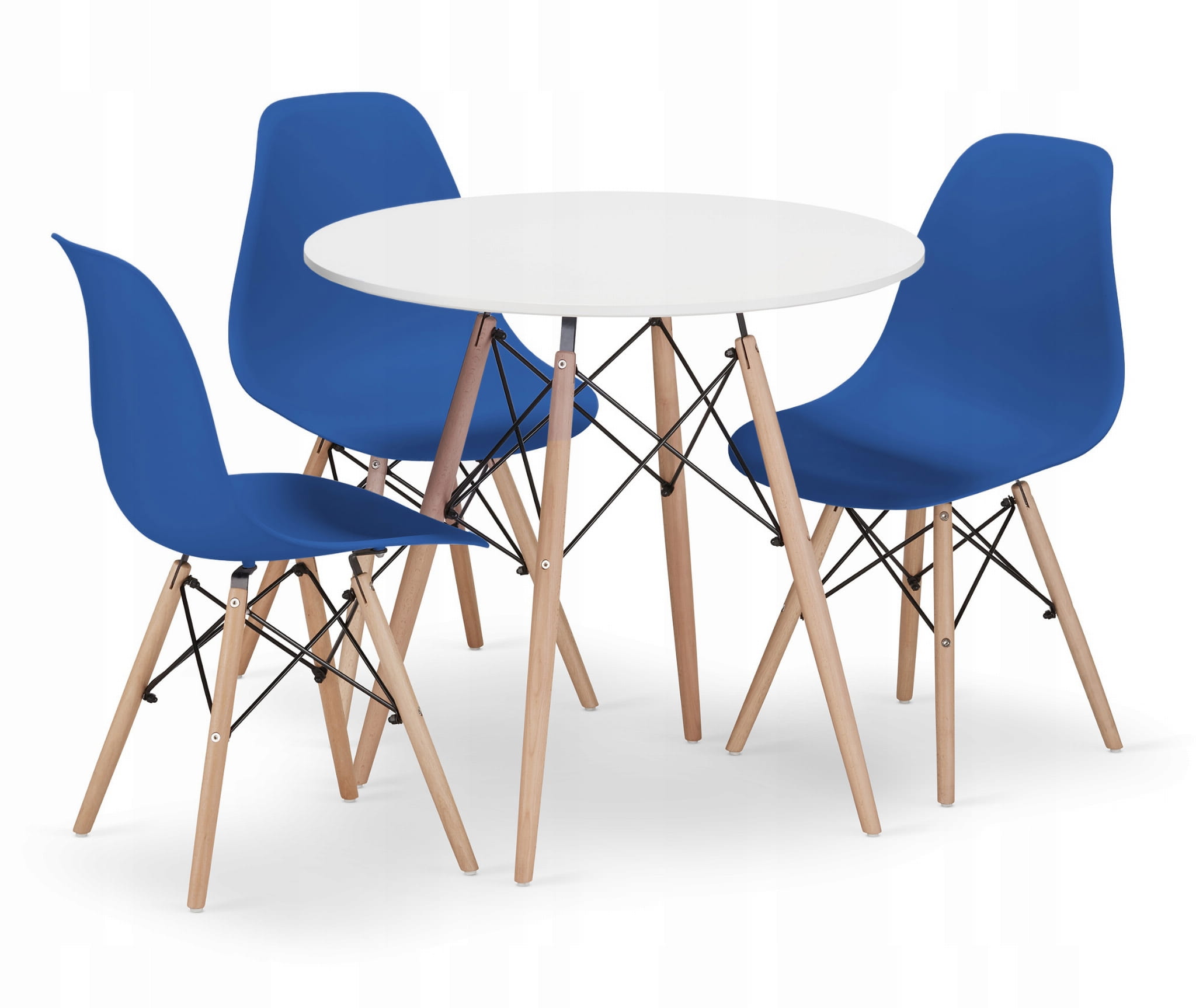 Zestaw stół z krzesłami: stół okrągły TODI 80cm biały + 3 krzesła OSAKA niebieskie